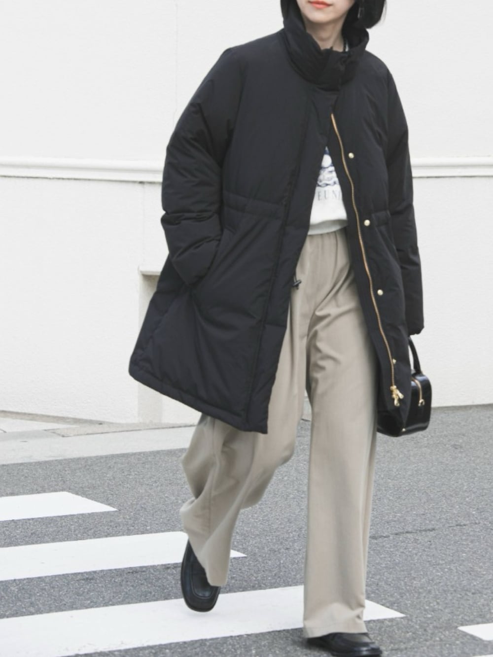 ウエストと裾のドローコードを絞ることで、シルエットに変化をつけられます。メリハリがつくので、ダウン特有の着ぶくれ感がなく、すっきりと着こなせます。