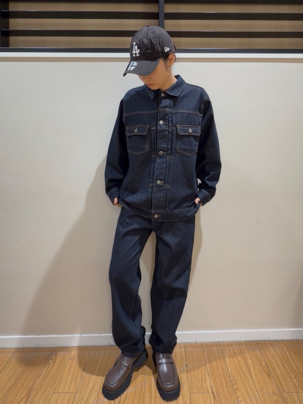 程よくゆとりのあるジャケットがこなれ感を演出し、デニムでラフさをプラス。