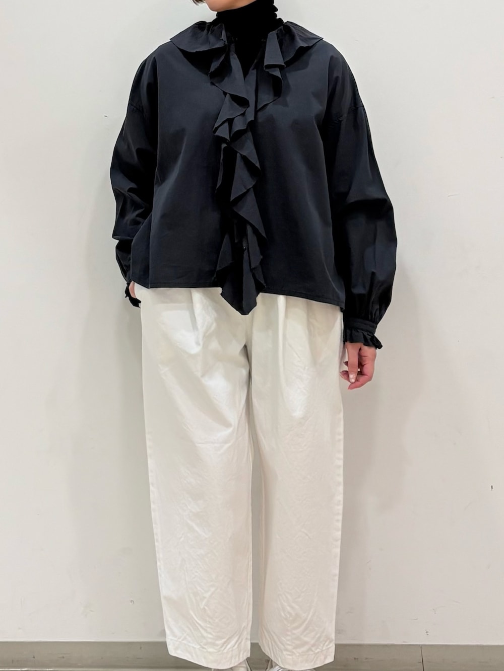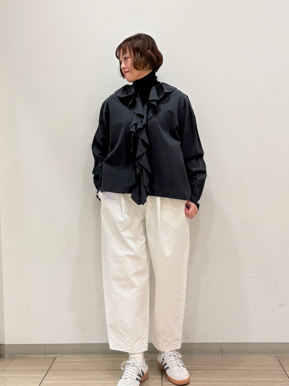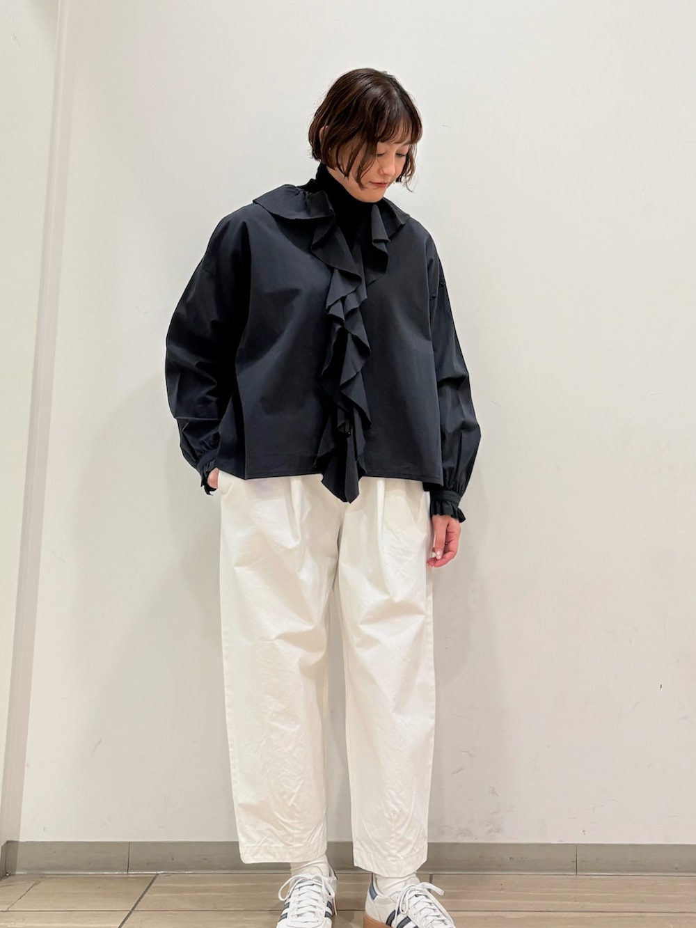 フリルが可愛いフリルシャツに定番のクロップドパンツ。