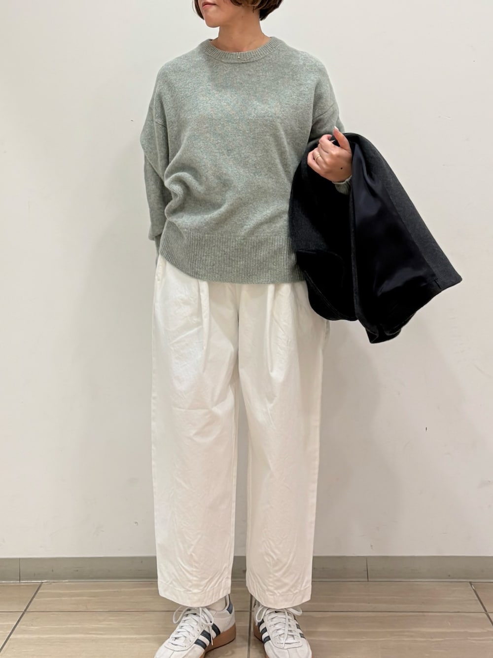 暗くなりがちな冬のコーディネートですが、ミント色のニットとオフホワイトのクロップドパンツで爽やかに♪
