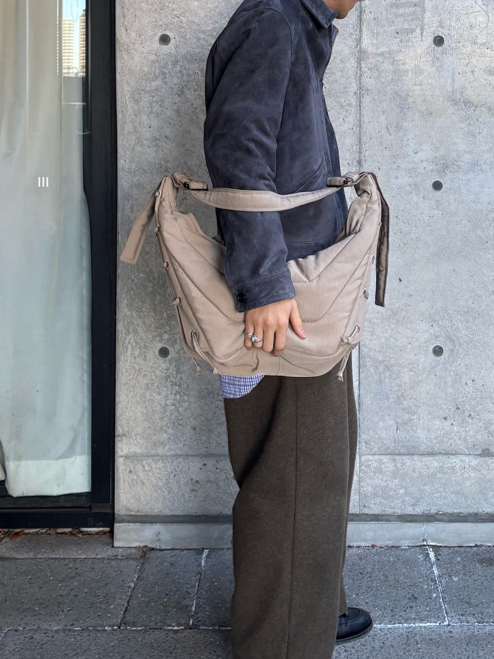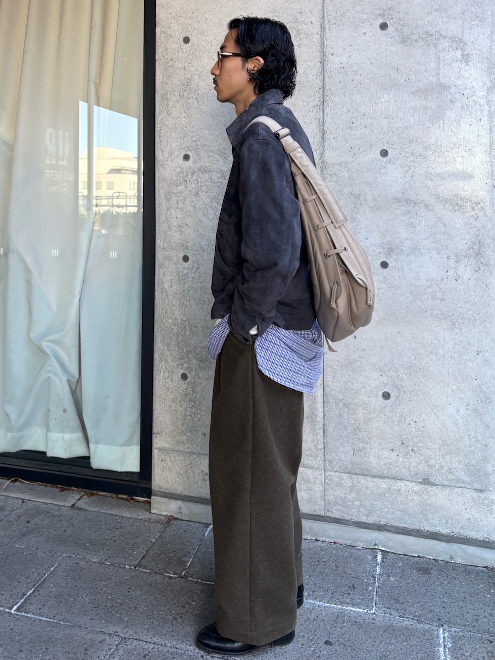 上質なスウェードは綺麗に着るのではなく、崩して着ていきたい。