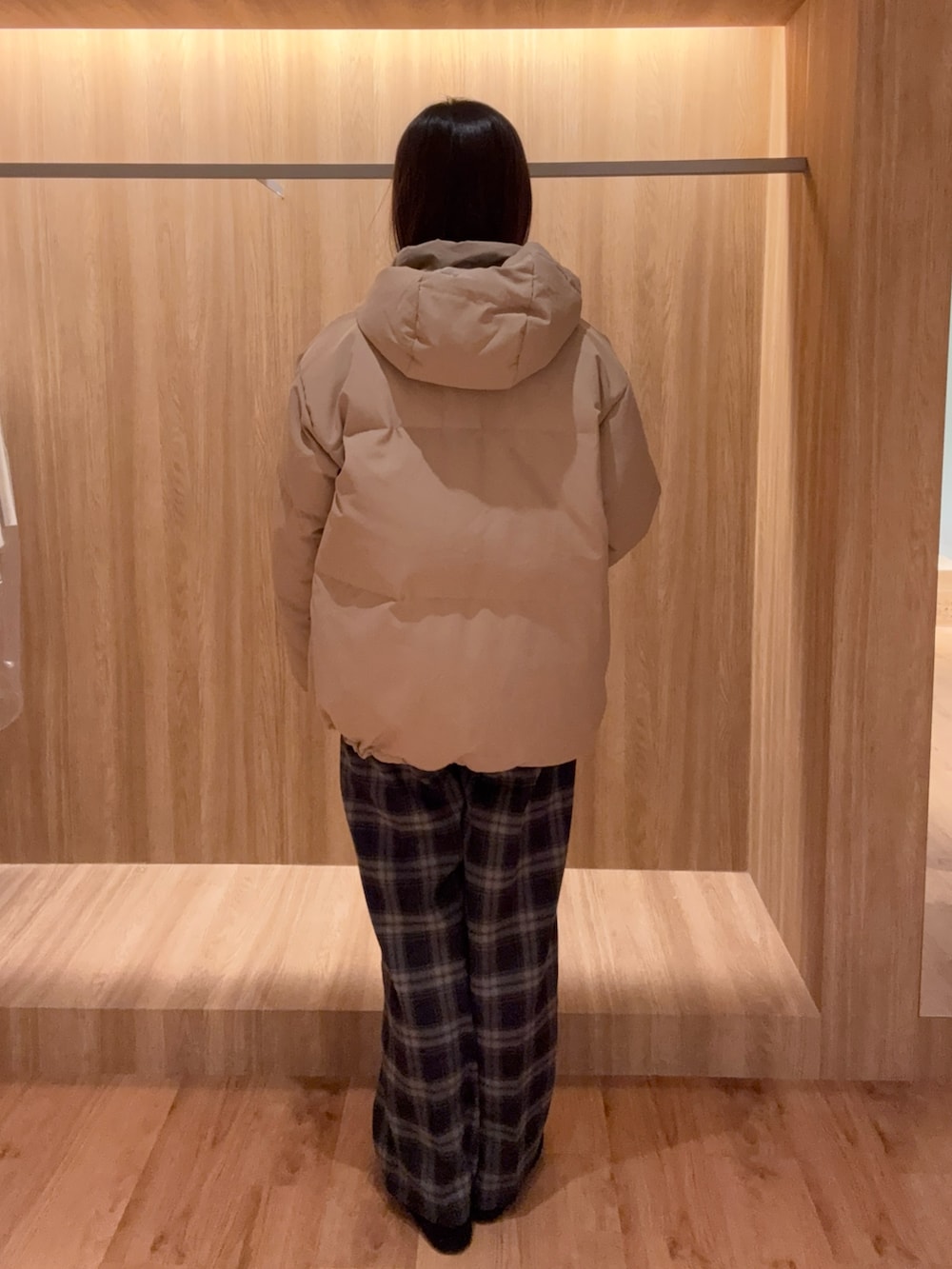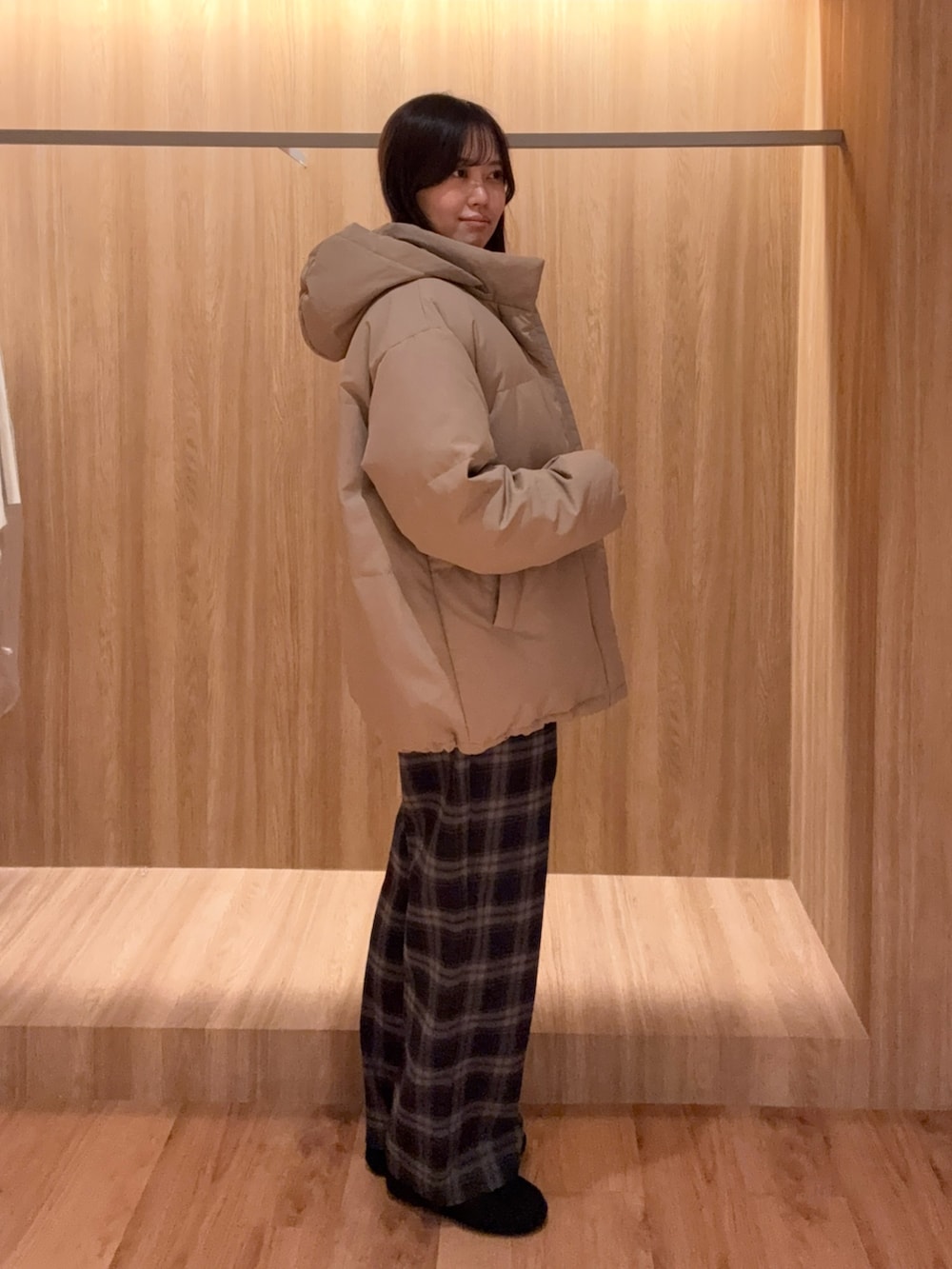 インナーはシンプルな裏起毛スウェットカーディガンであたたかく、チェックパンツを合わせて季節感を出しました☺️