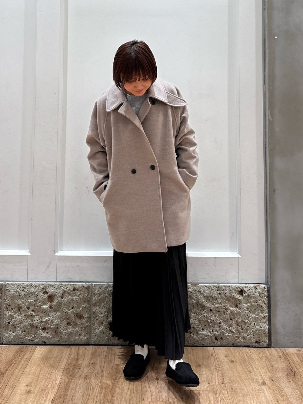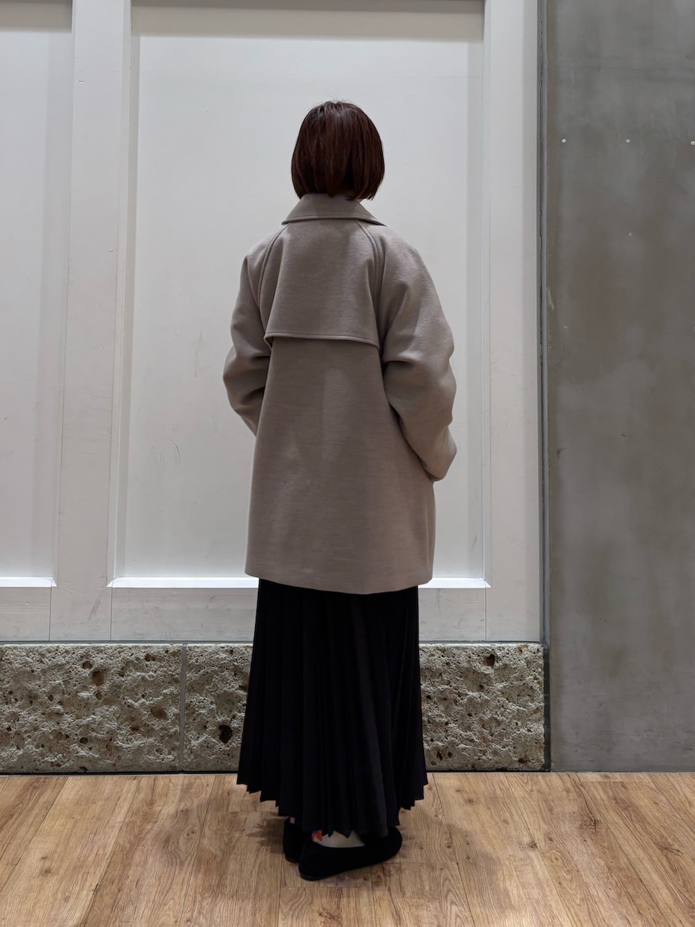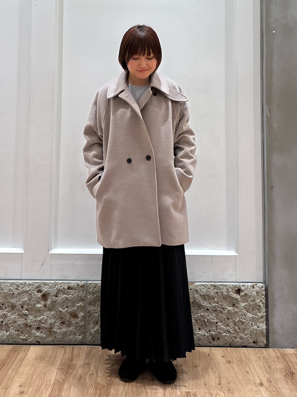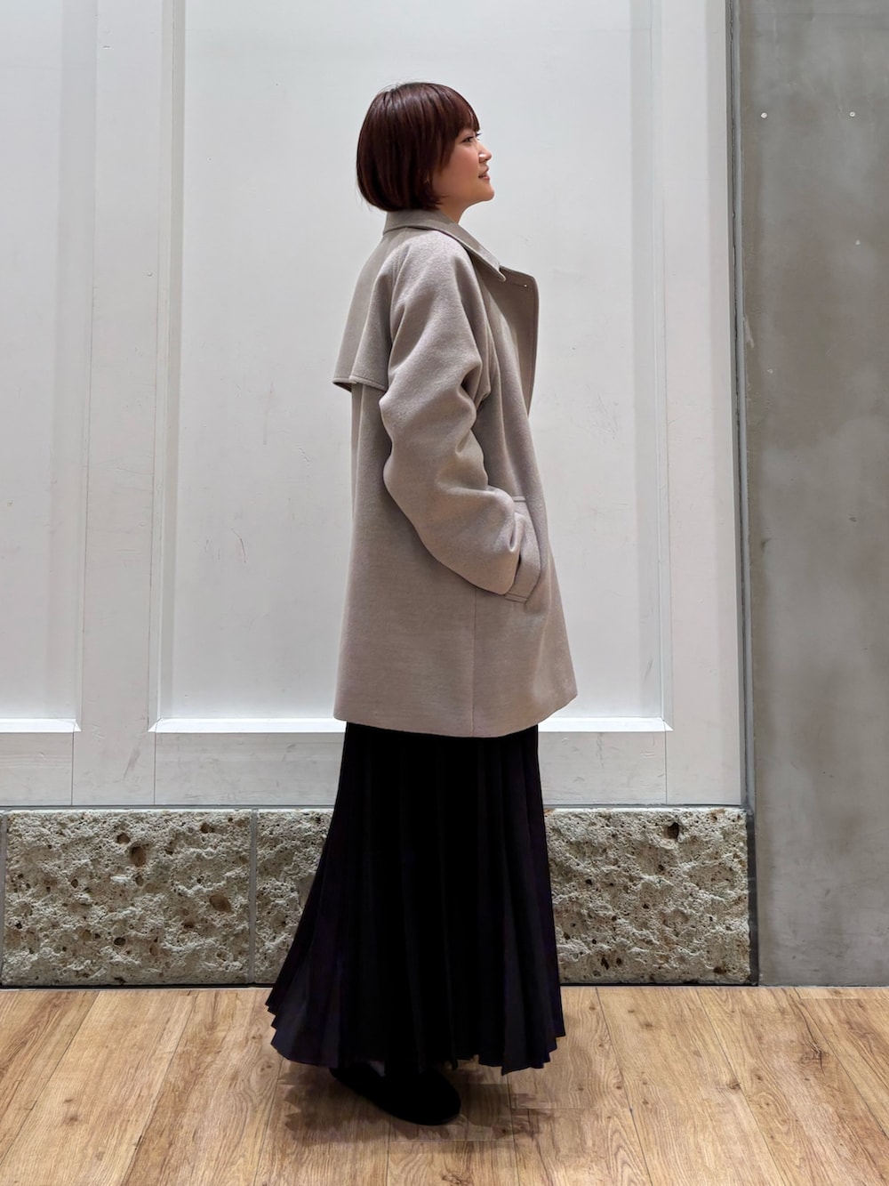 UR TECHのミドル丈コート着用しています!ミドル丈なので全体をすっきりと見せて着ることができ、パンツやスカートなどの形を選ばずに綺麗に着ることができますよ◎(158cmでお尻が隠れる長さです)