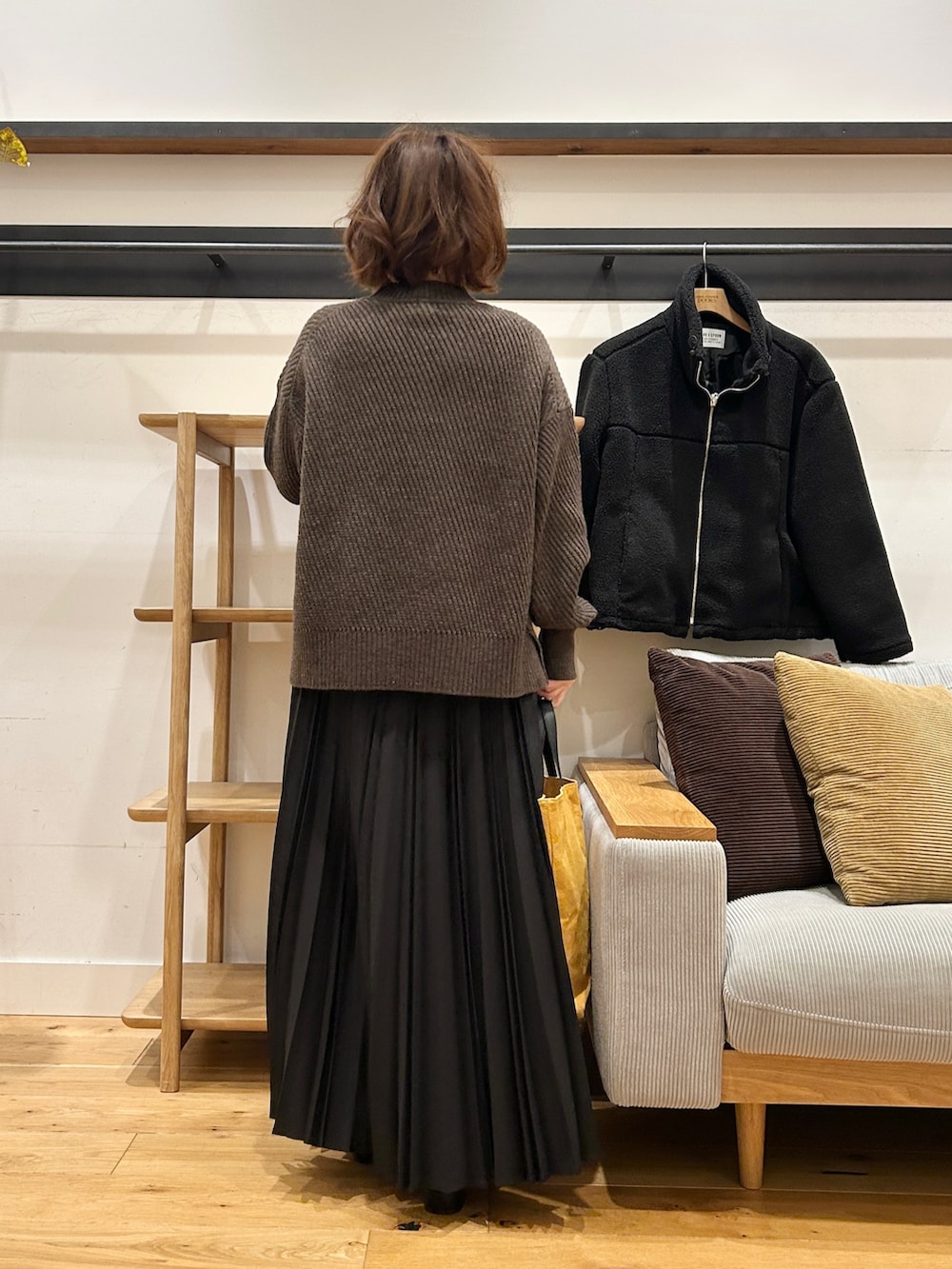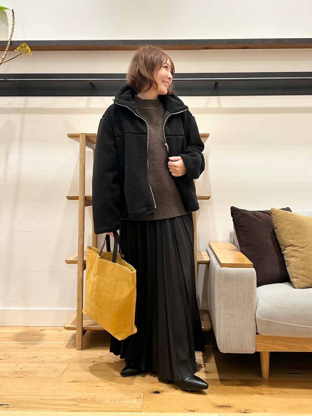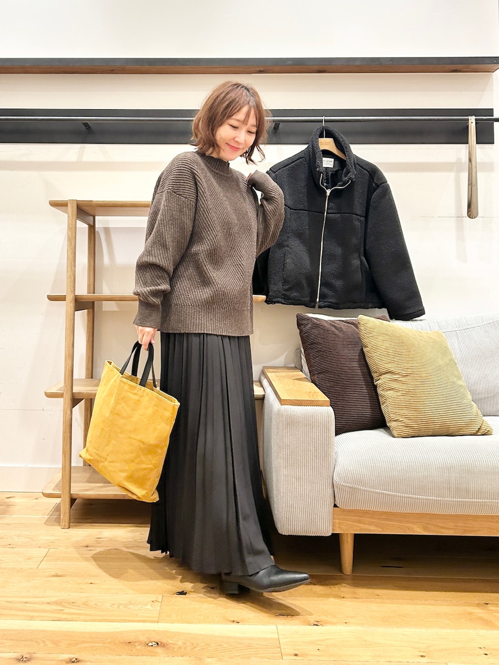 ダークブラウンはスエード素材で、コーデに季節感をプラスしてくれます。