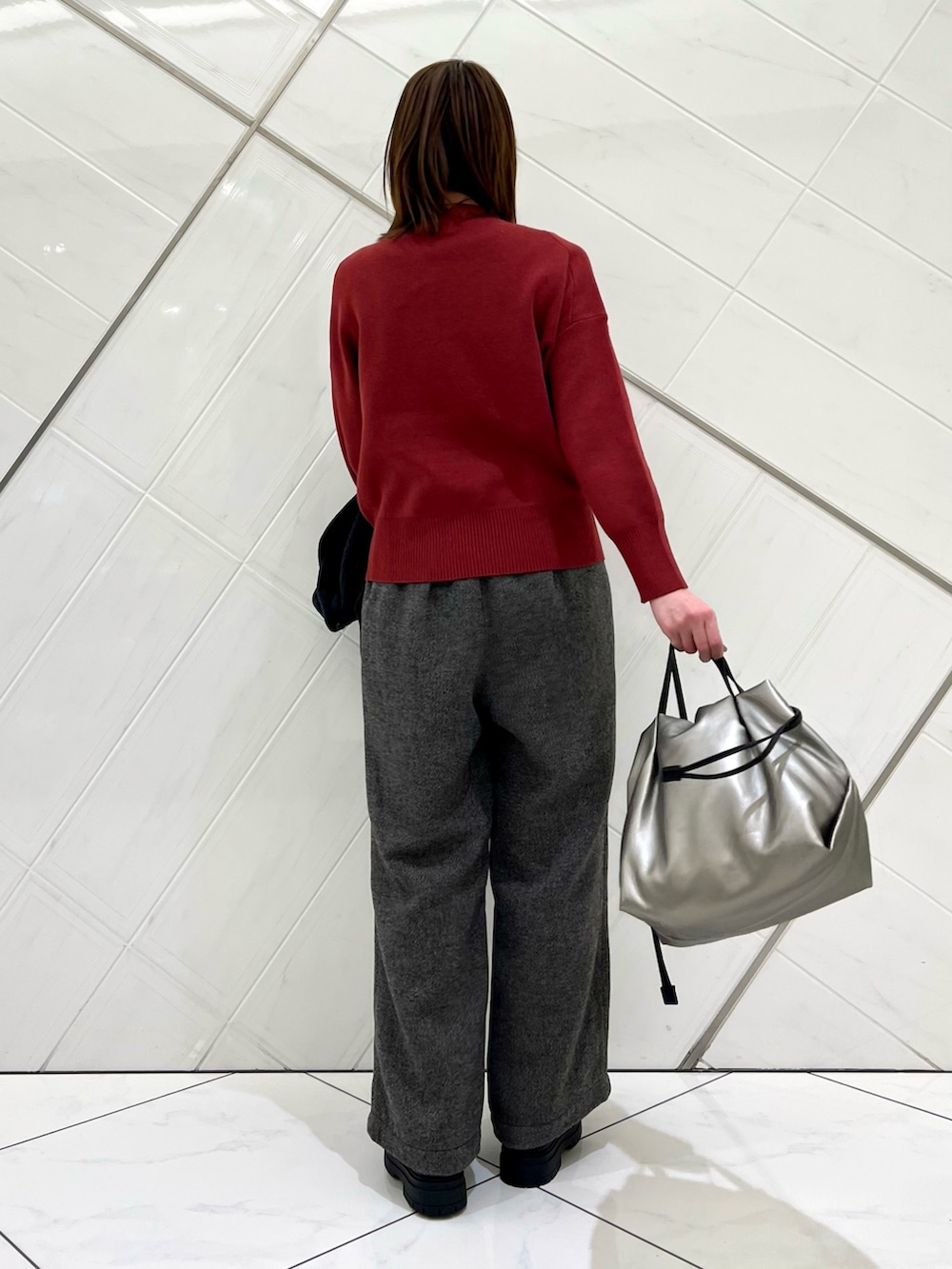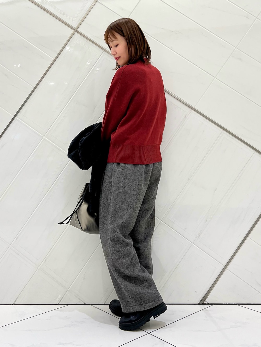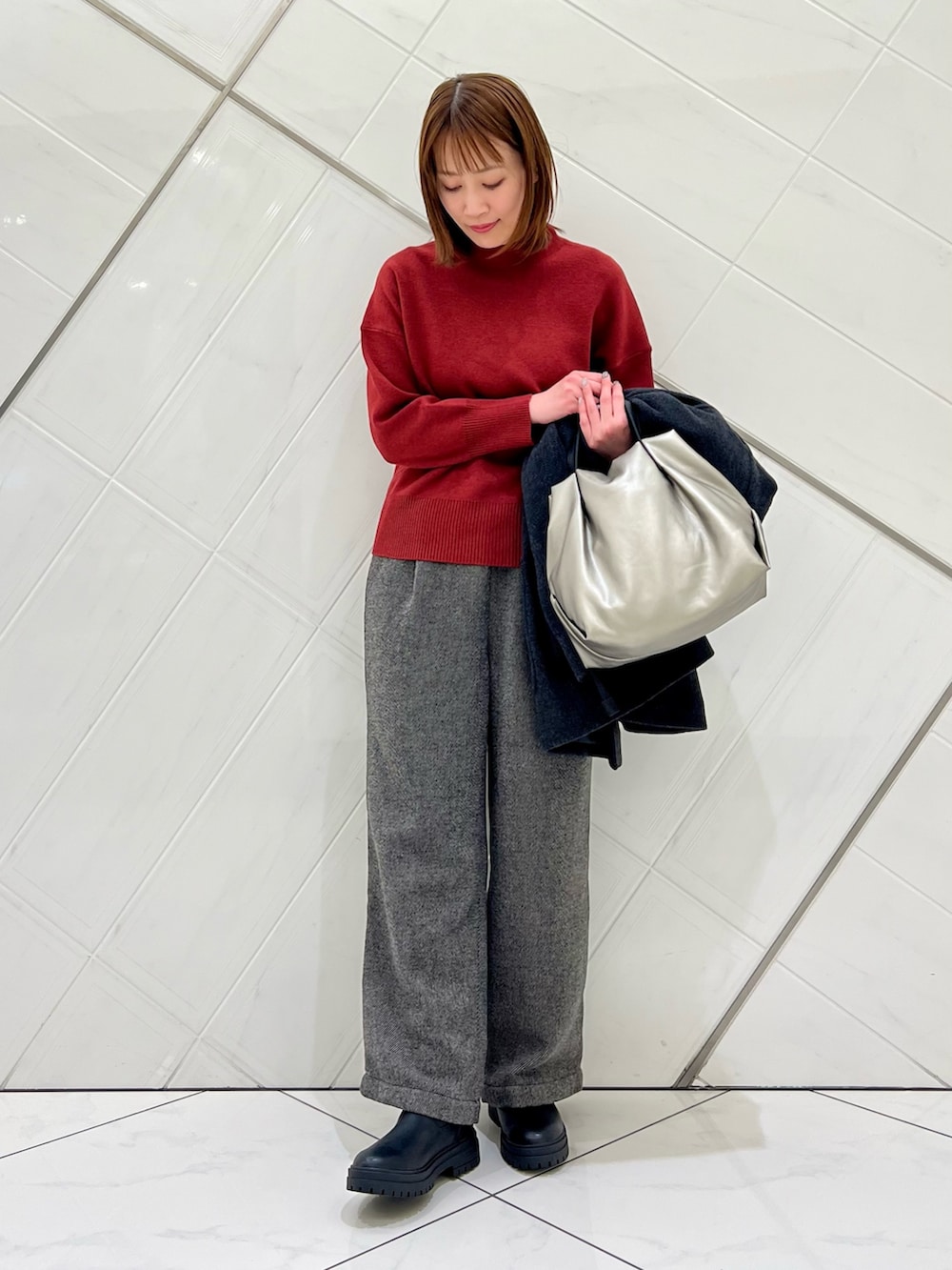落ち着いたレッドカラーが目を惹くニットは