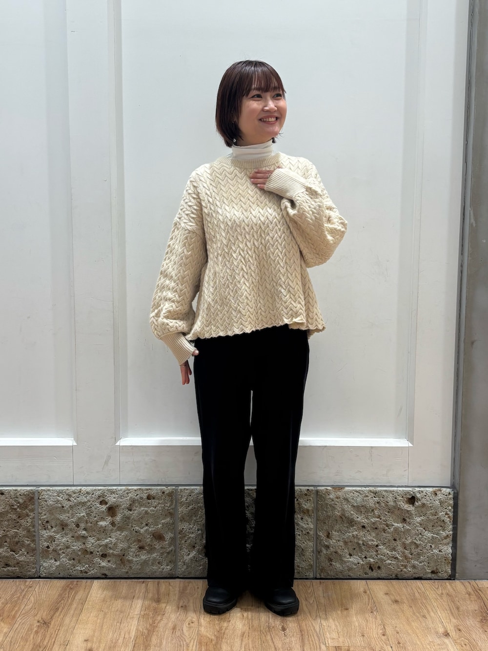 ニットには白のタートルネックインナーを入れみました☻タートルネックを着なくても首元がほどよくつまっているので綺麗な形で着ていただけますよ◎