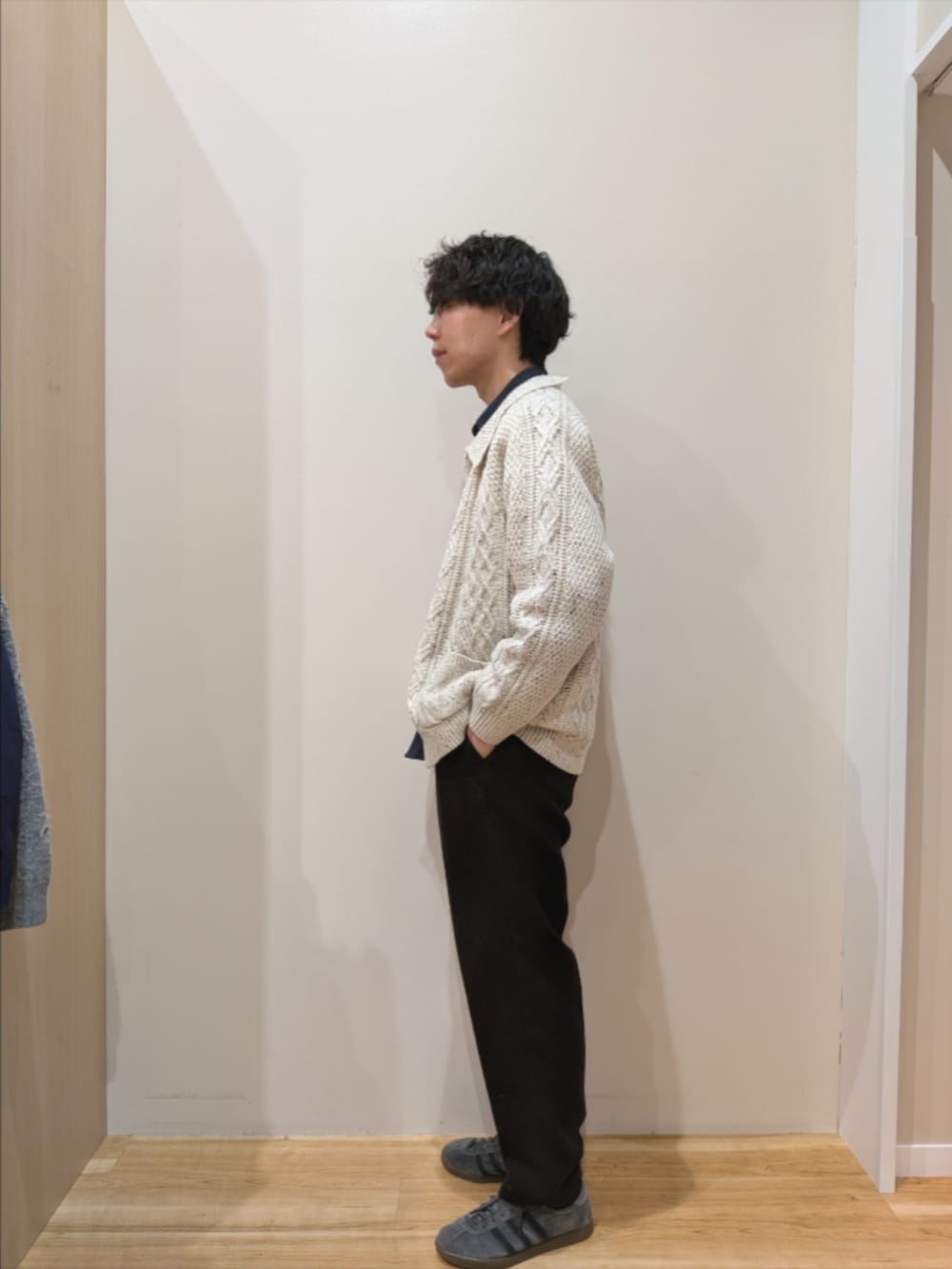 ツイードのスラックスを使った冬コーデになります。