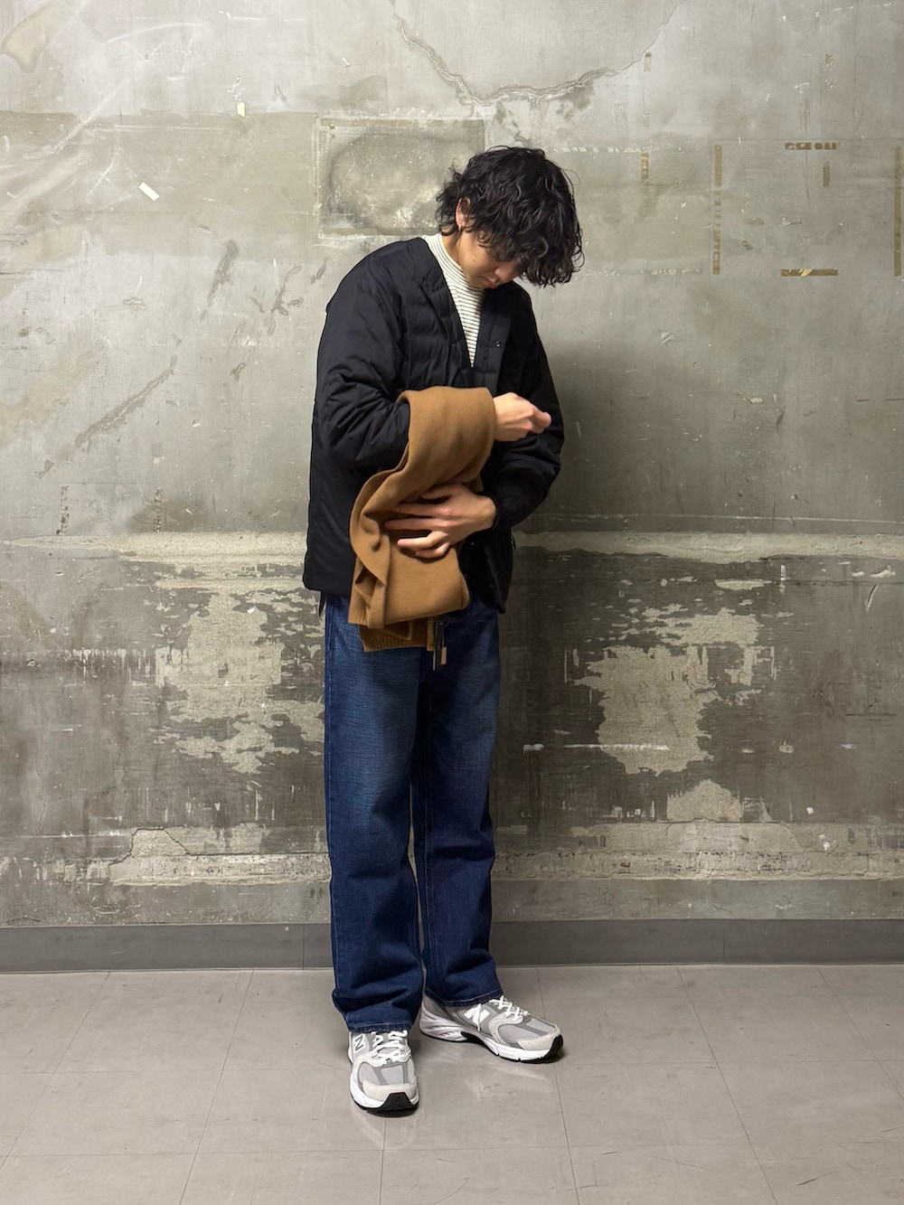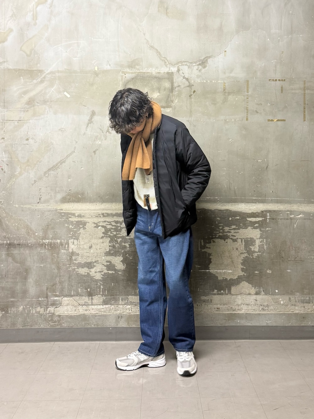 今回のコーディネートは、襟のない別注のナンガのインナーダウンの特性を活かし、ボリュームのあるブラウンのマフラーをコンパクトに巻いてみました。視線が上に誘導されるだけでなく、顔周りに温かみのある色が来ることで、冬らしい柔らかな表現をできているのではと思います!