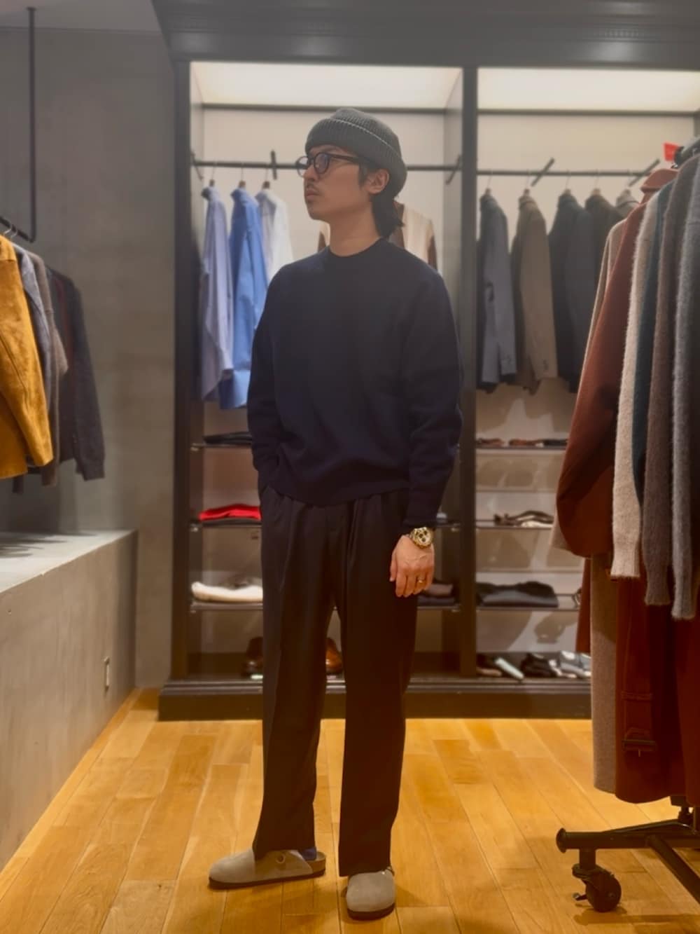 ネイビーのニットにネイビーのスラックス足元はボストンでラフに🐒