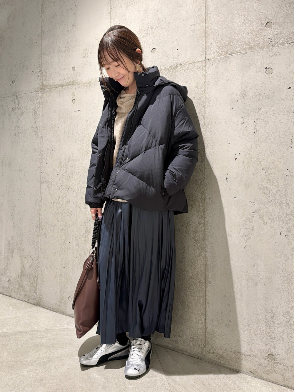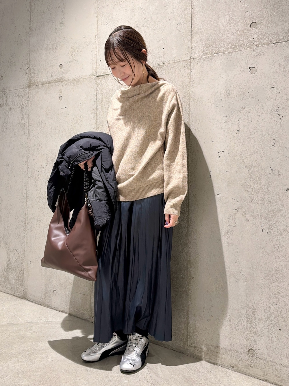 今回は、光沢感が上品な印象のプリーツスカートを合わせたキレイめコーディネートです。