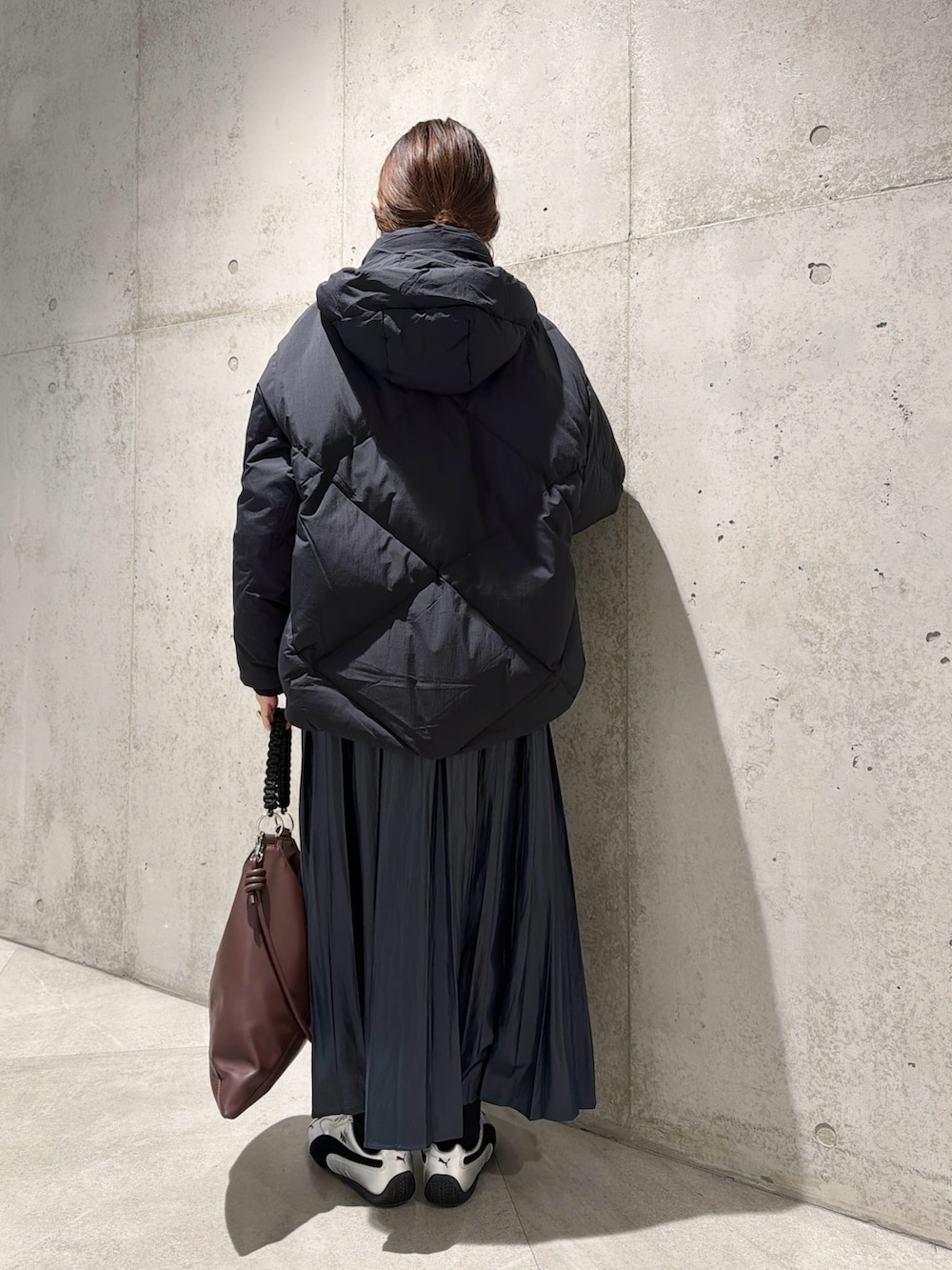 大きめのダイヤキルティングが、洗練された大人カジュアルにぴったりです。