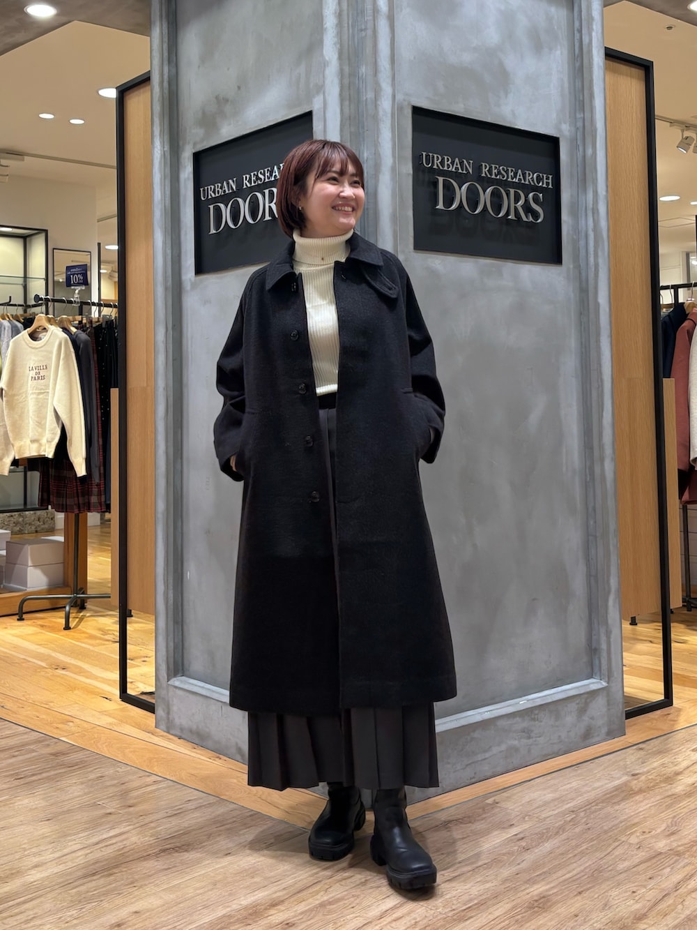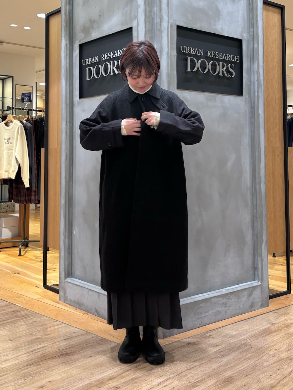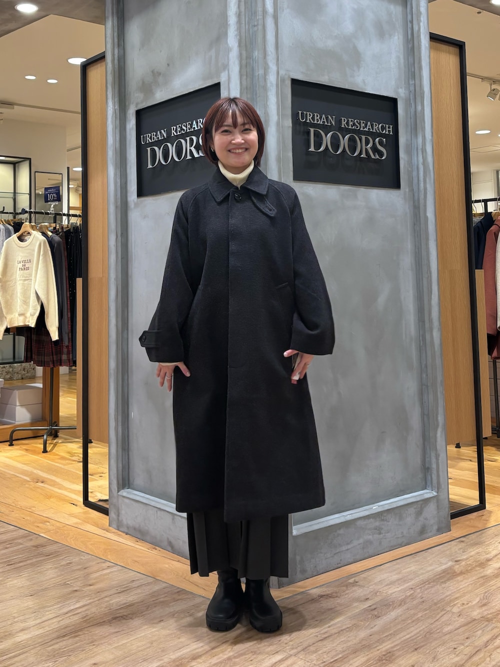 ウール100バルカマーンコート着用しています!ウール100%なのであたたかくそして軽いですよ◎シンプルなデザインなので上品なシルエットになるので、シーンを選ばずに着ていただけます☻