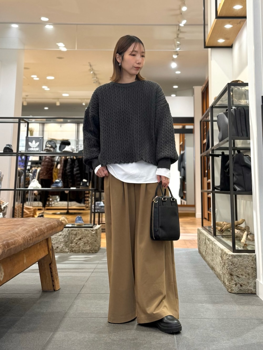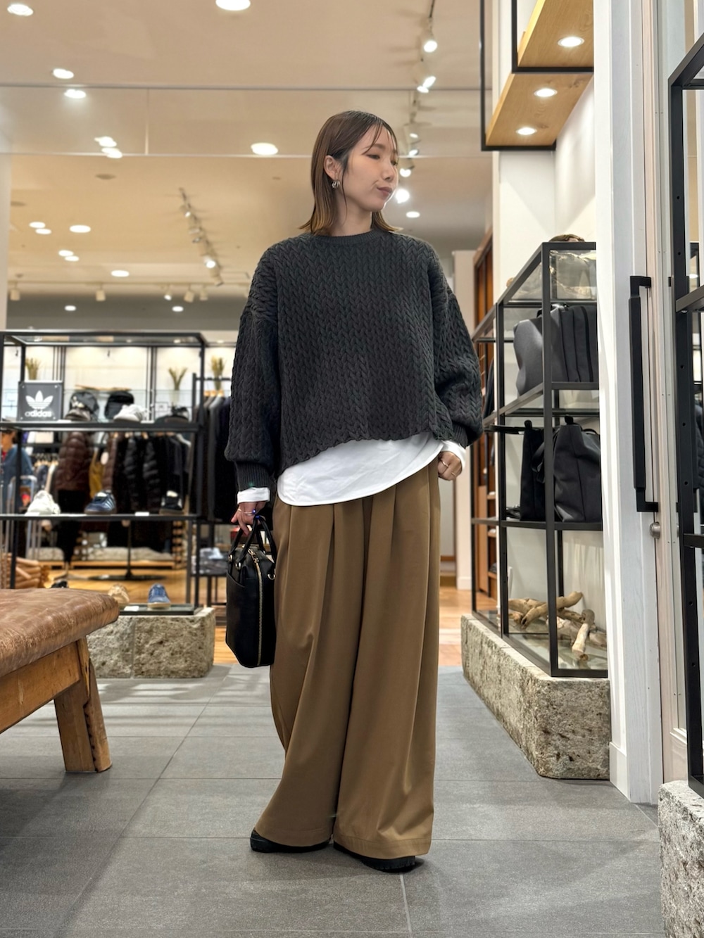 ショート丈ですっきり着られるシンプルなニットですが、ヘリンボーンの柄が程良く表情が出て大人カジュアルにぴったりのアイテムです!