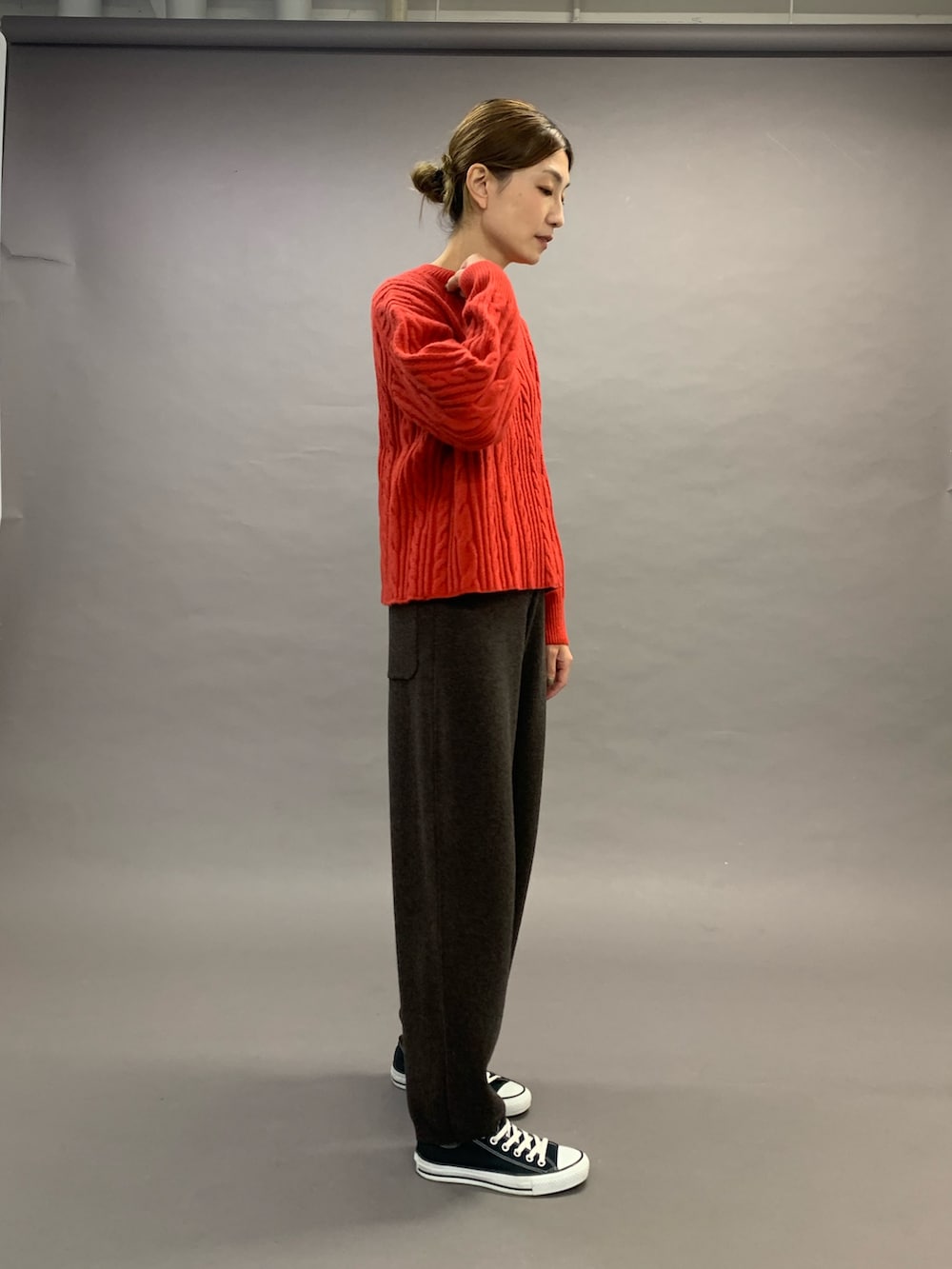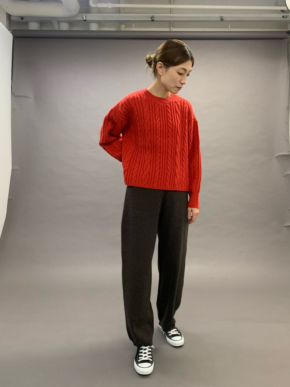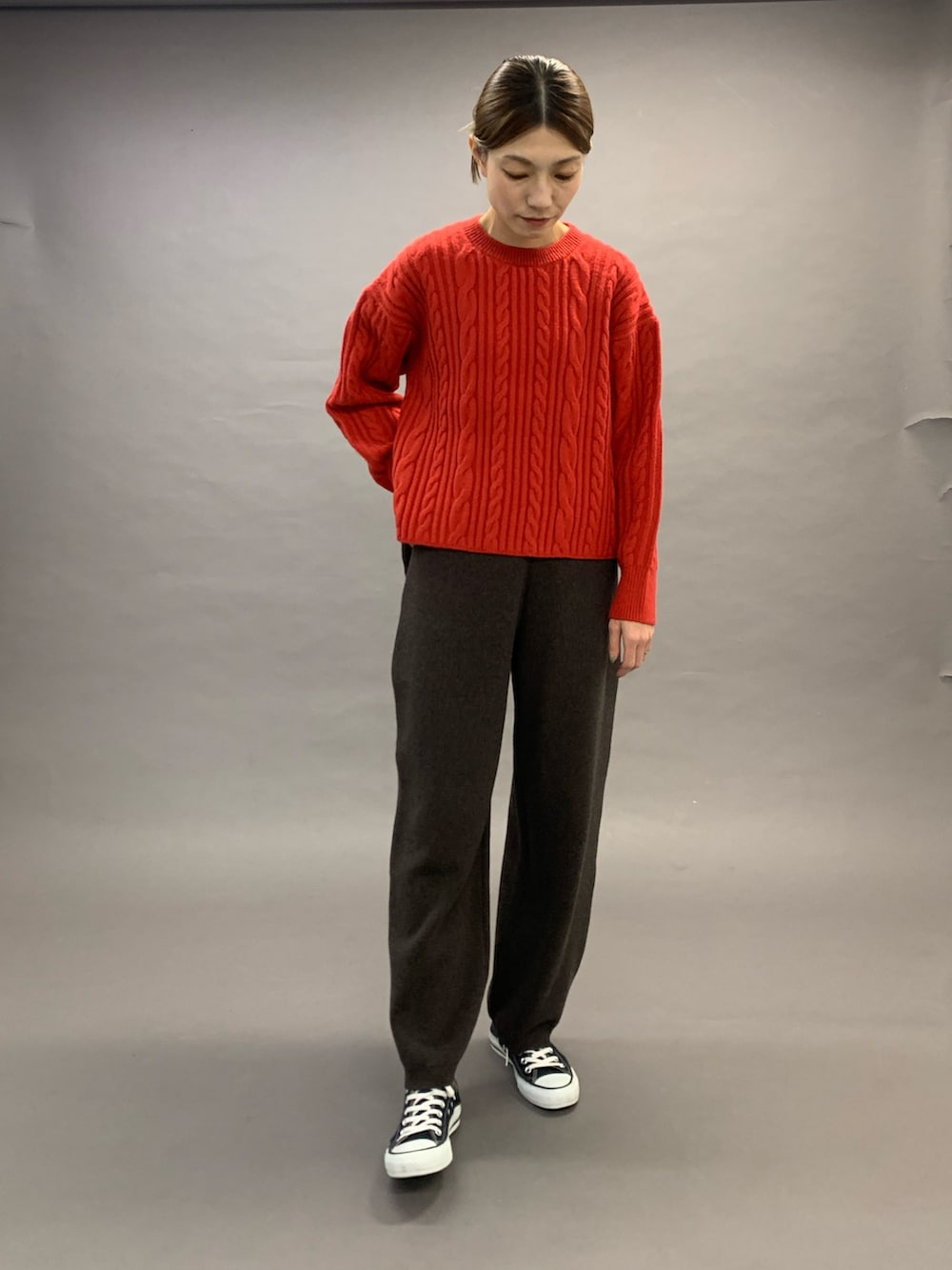 トップスは、ウールは入っておらず見た目はほっこり冬らしい編みが着るだけで主役のニットです。