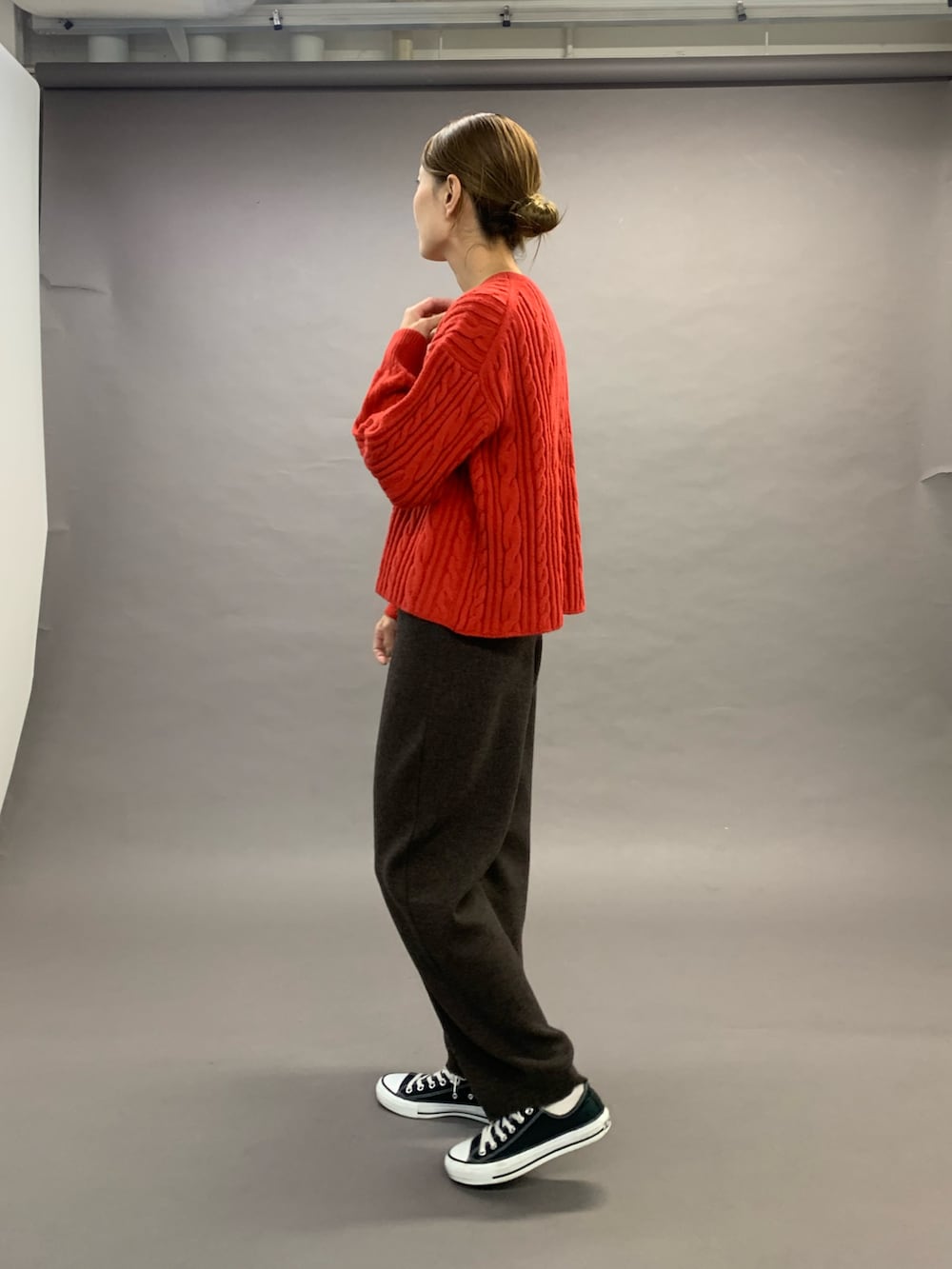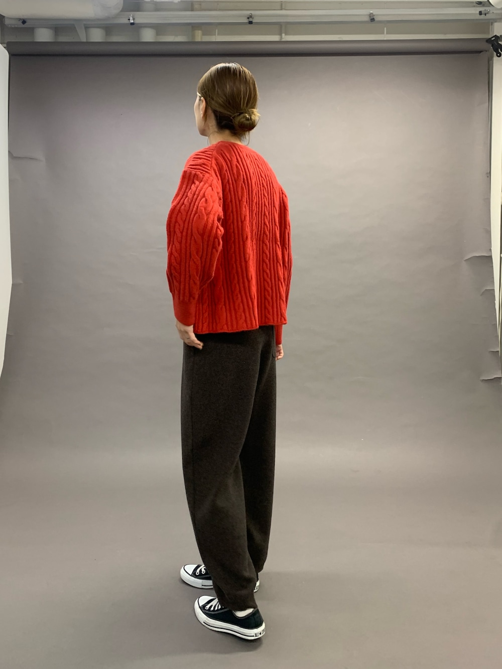 ボトムは、コットンとメリノウールの混紡糸を使用。ほどよくボリュームシルエットのパンツで、シャツワンピースなど丈の長いトップスに、重ねて着ても◎