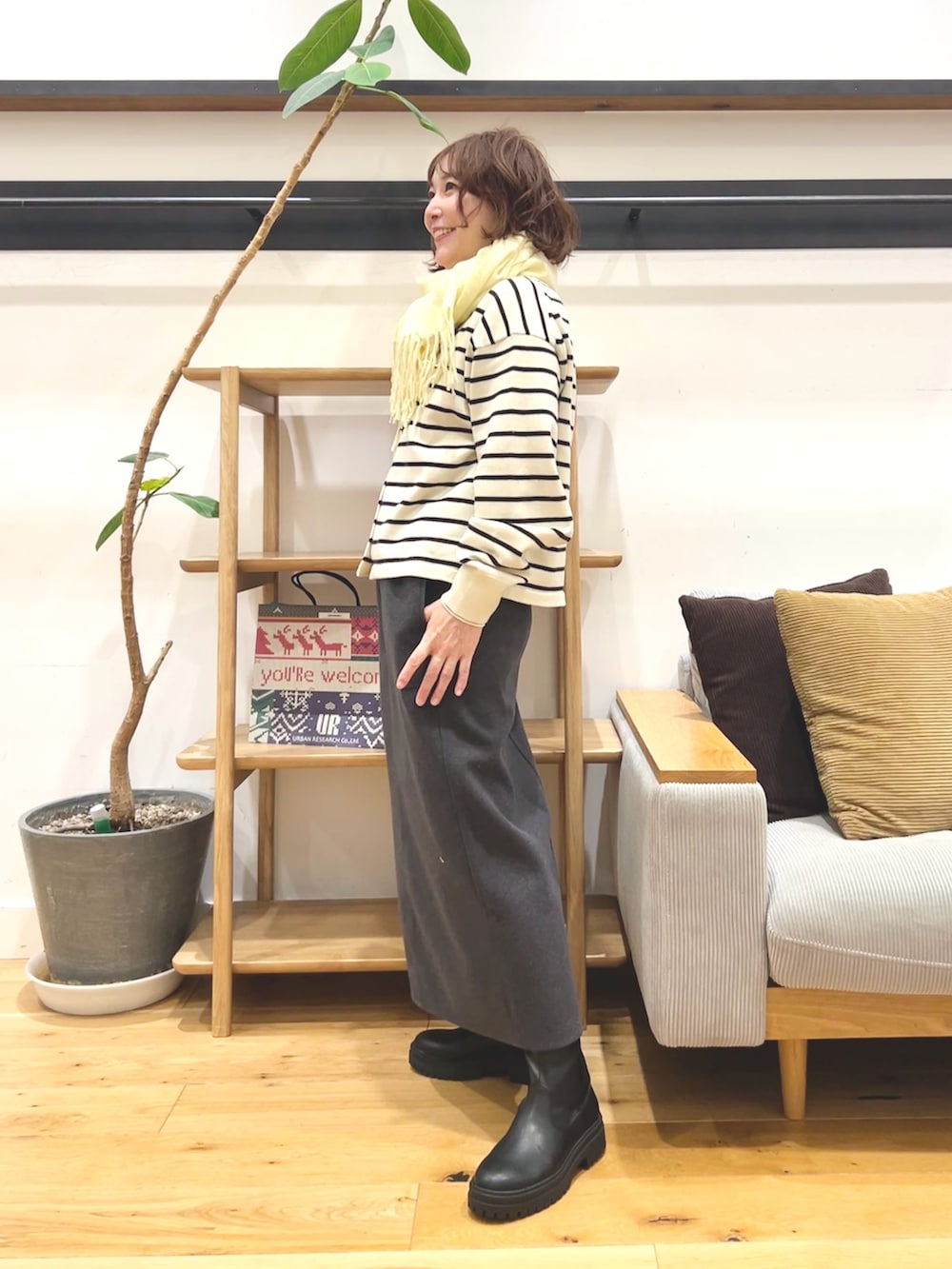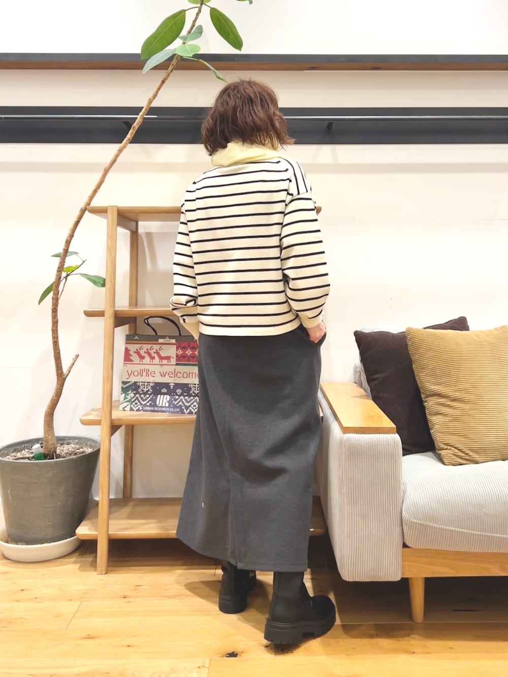 ニットスカートだけどラインはすとんと落ちるので、オーバーサイズのトップスを合わせてもバランス取りやすいです。