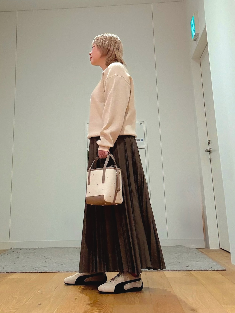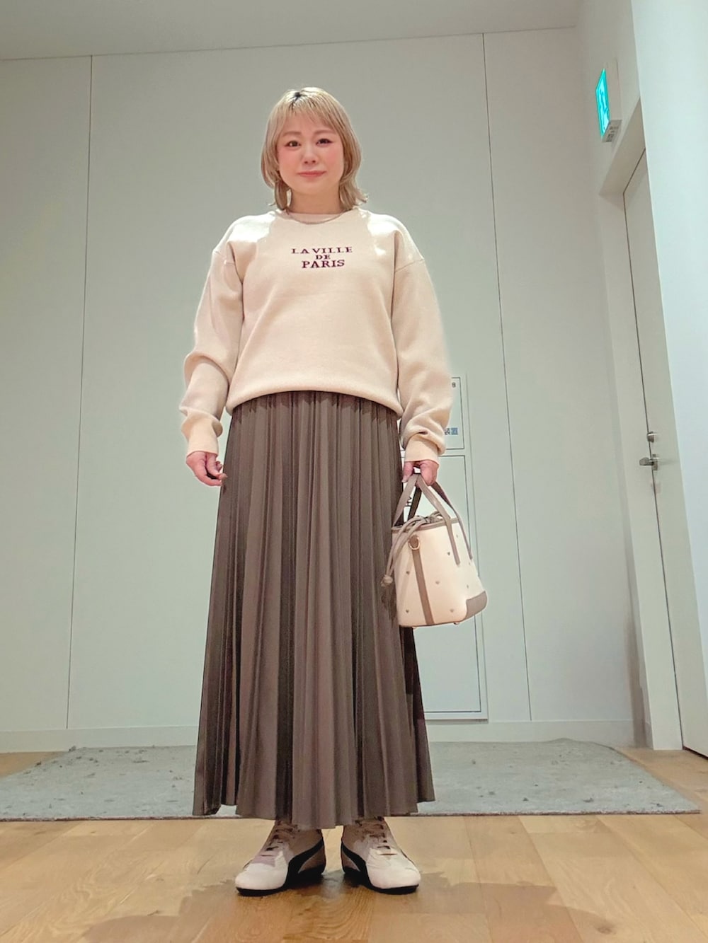 人気のロゴニットと合わせました。ニットとロゴの相性抜群、カジュアルすぎずに着れるところが嬉しいポイントです。