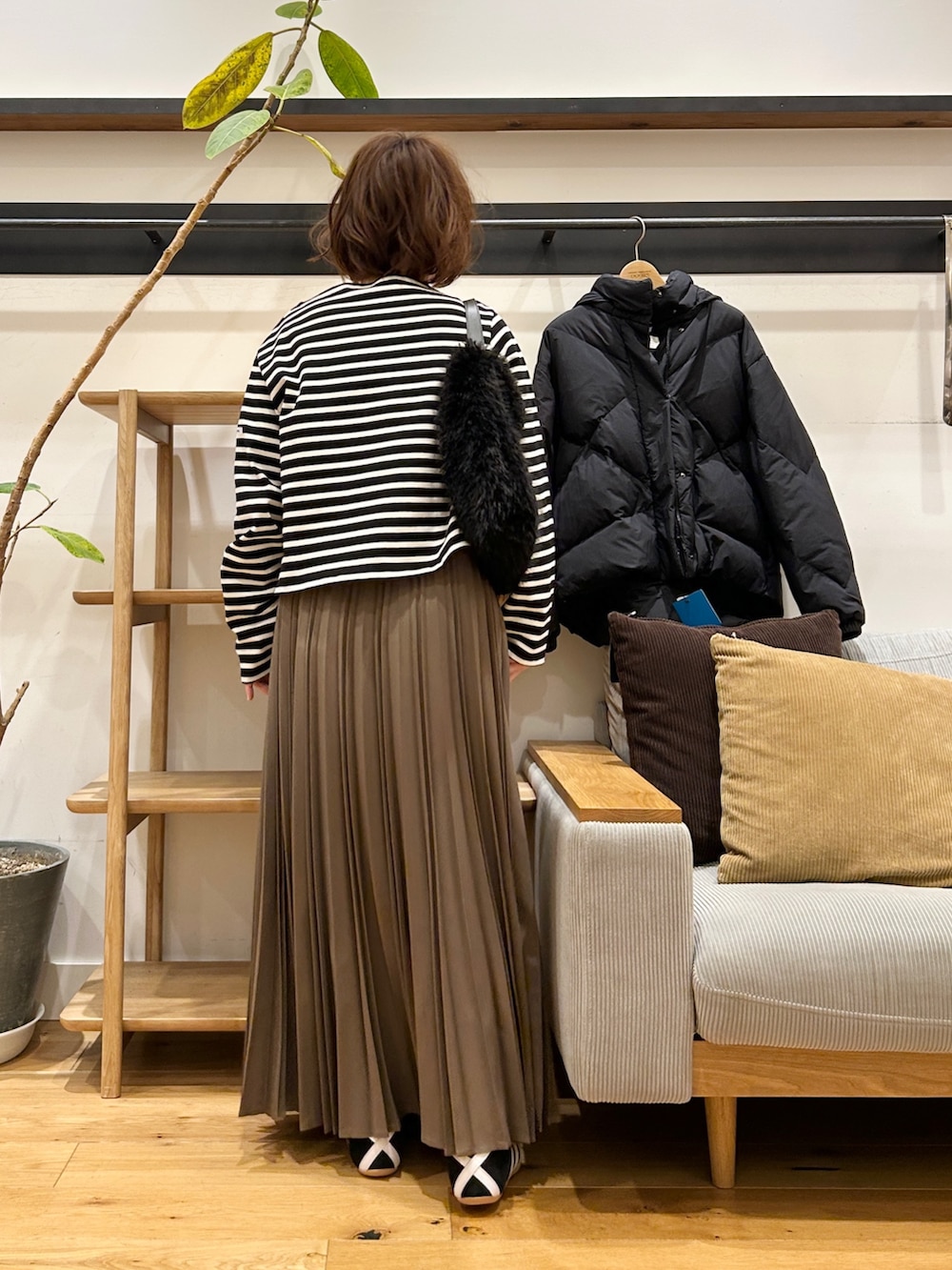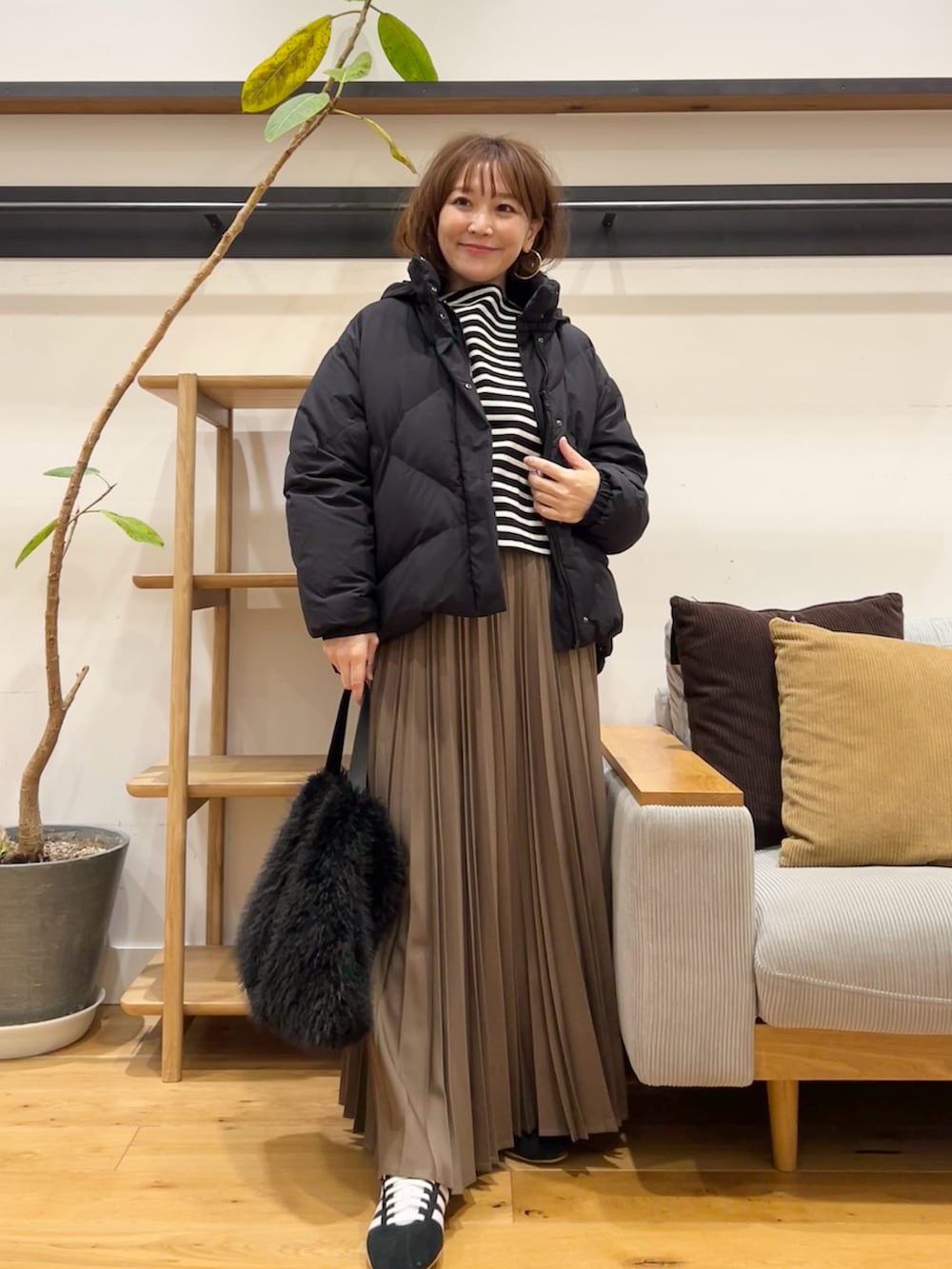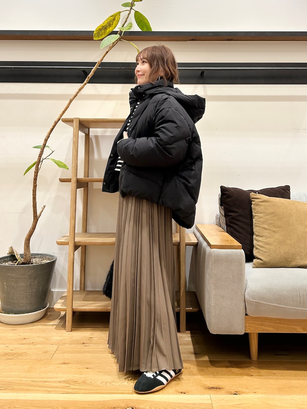ウールライクなツイル素材、細かくきれいに入ったプリーツが動くたびに揺れて、ニットやスウェットなどボリュームのあるトップスと合わせてもバランスよく着ていただけます♪