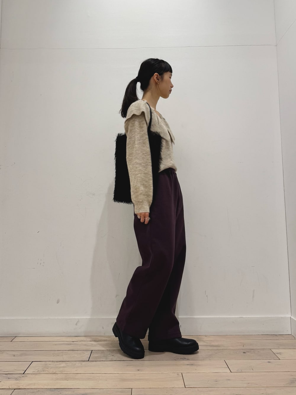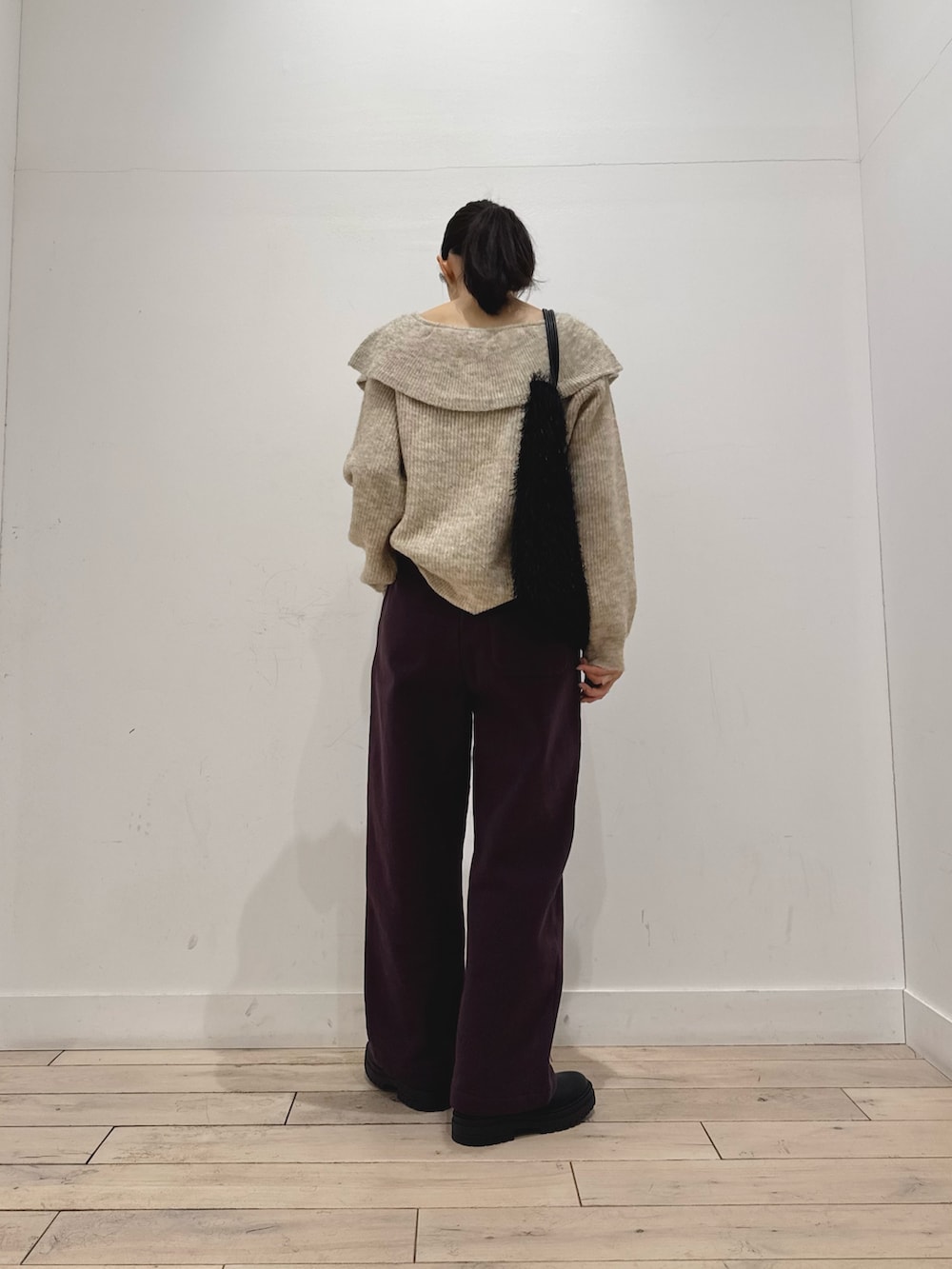 ニットは鎖骨がキレに見える開き具合です。苦手な方はシアー系のインナーやタートルネック入れてもいいと思います◎