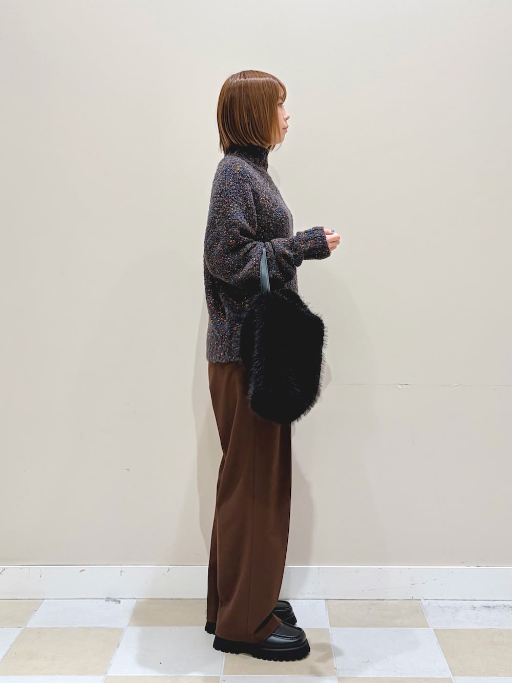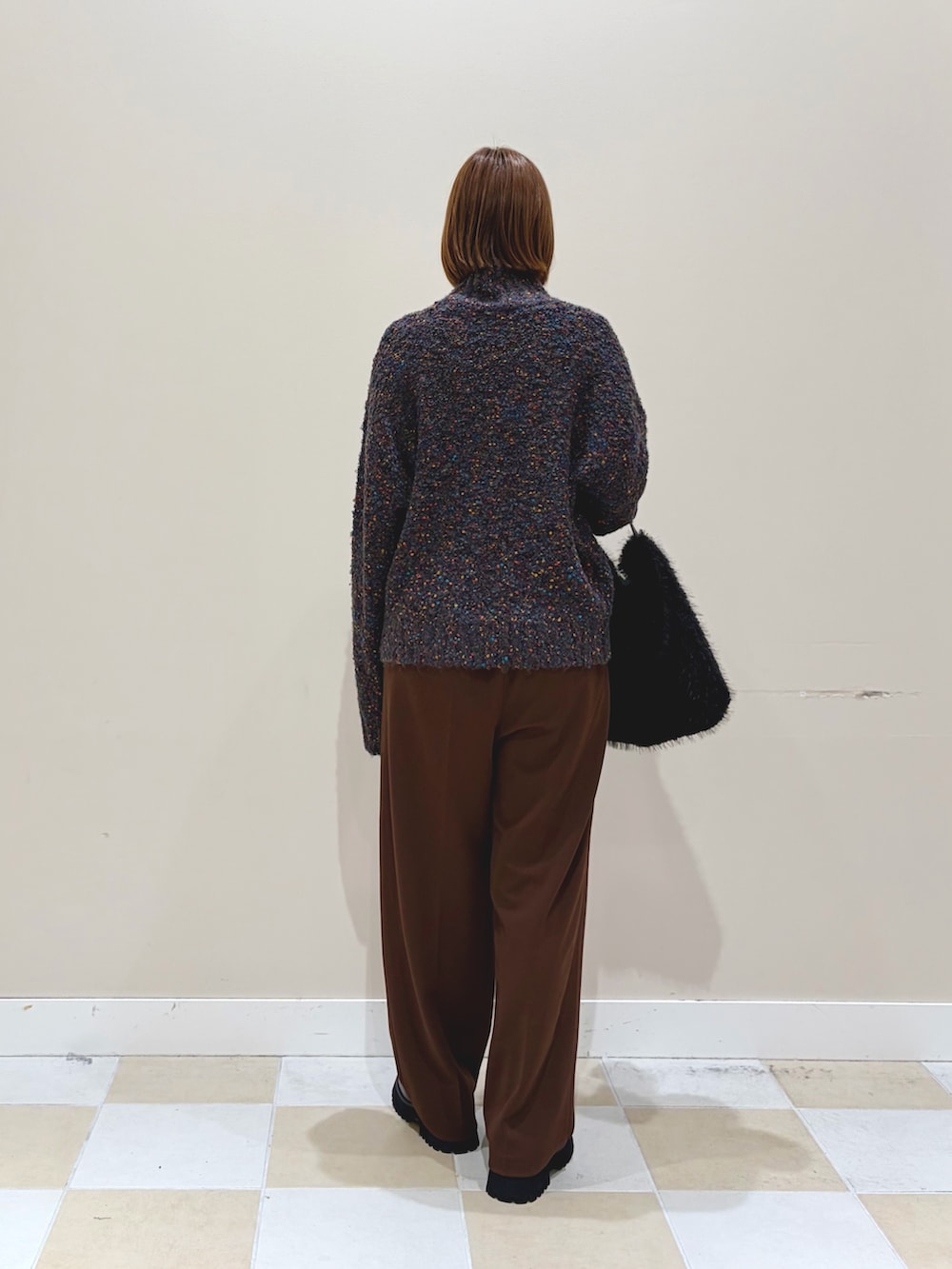 カラーネップがポイントのハイネックニットとイージーパンツでナチュラルでラフなスタイルに。