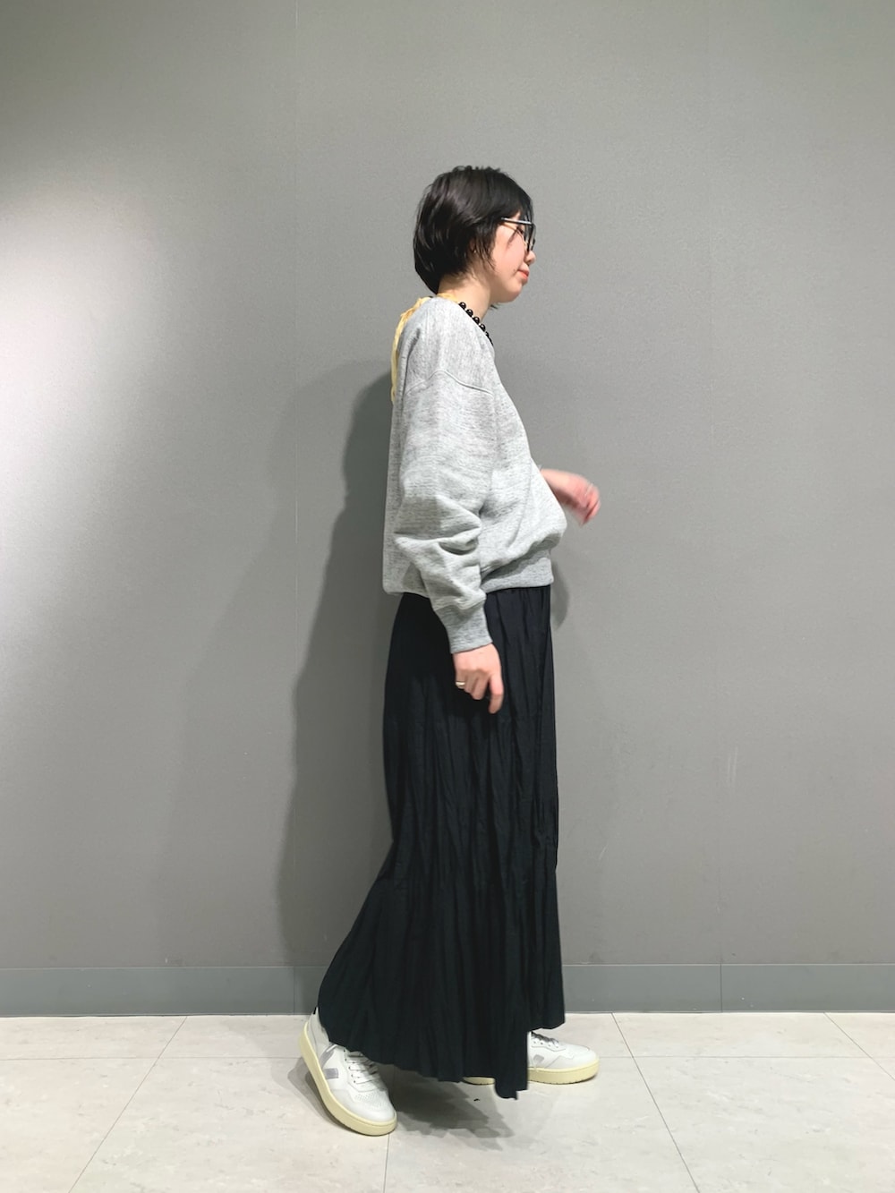 シワ加工スカートは動きと雰囲気が出てコーディネートの幅が広がります。丈が程よくあるので高身長の方も使いやすいです。シワ加工はお洗濯と共に変化していきますのでお洗濯後に絞って保管していただけると風合いが保たれます。