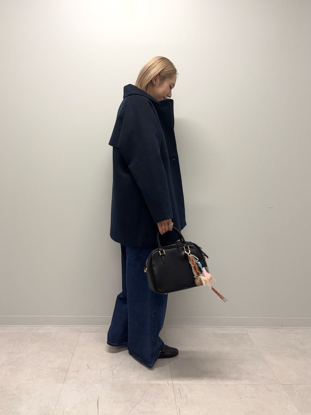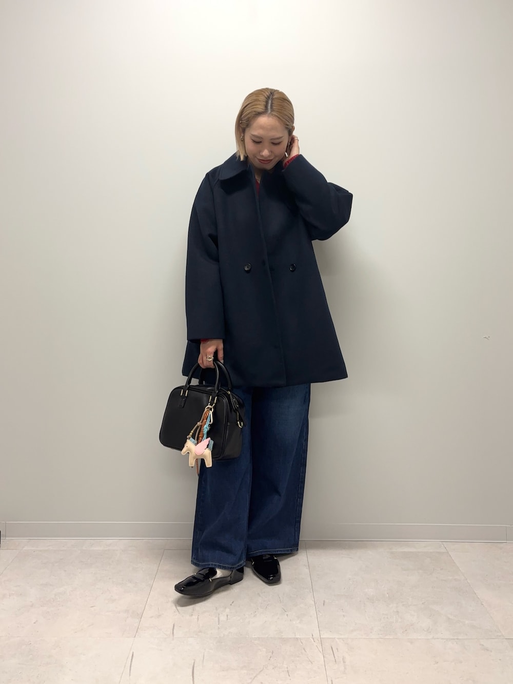 トップスは赤ニットを合わせていてネイビーとの相性がやはり可愛いです◎