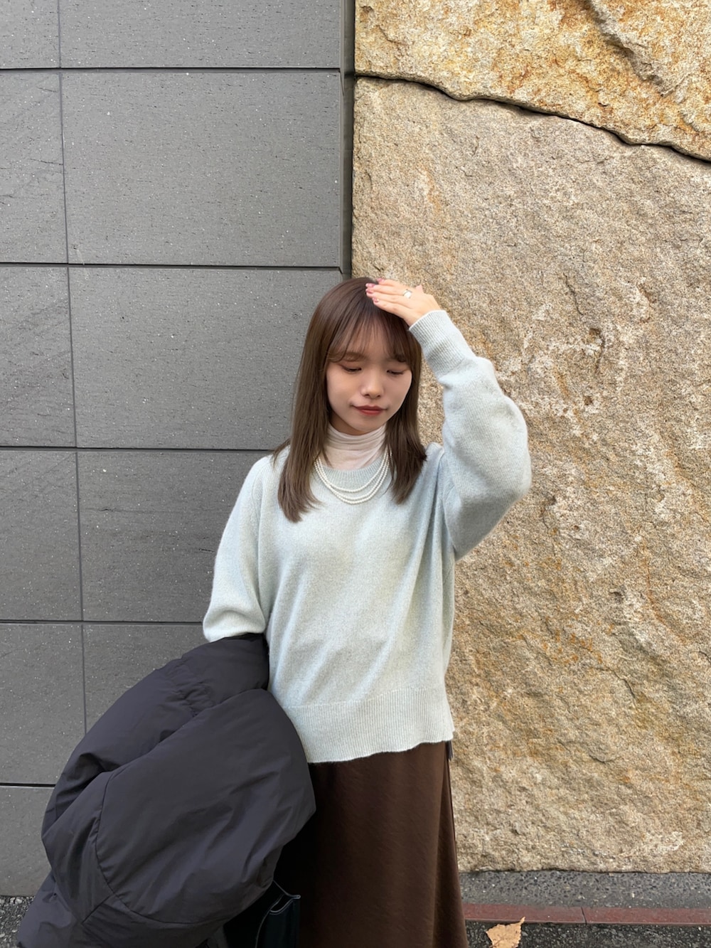 中のトップスはラメが散りばめられており、キレイめにも使えるニットです!着丈もちょうど良く、身幅もゆったりしているので、薄手のタートルと重ねて着ていただけます!さりげないラメなので挑戦しやすいですよ!