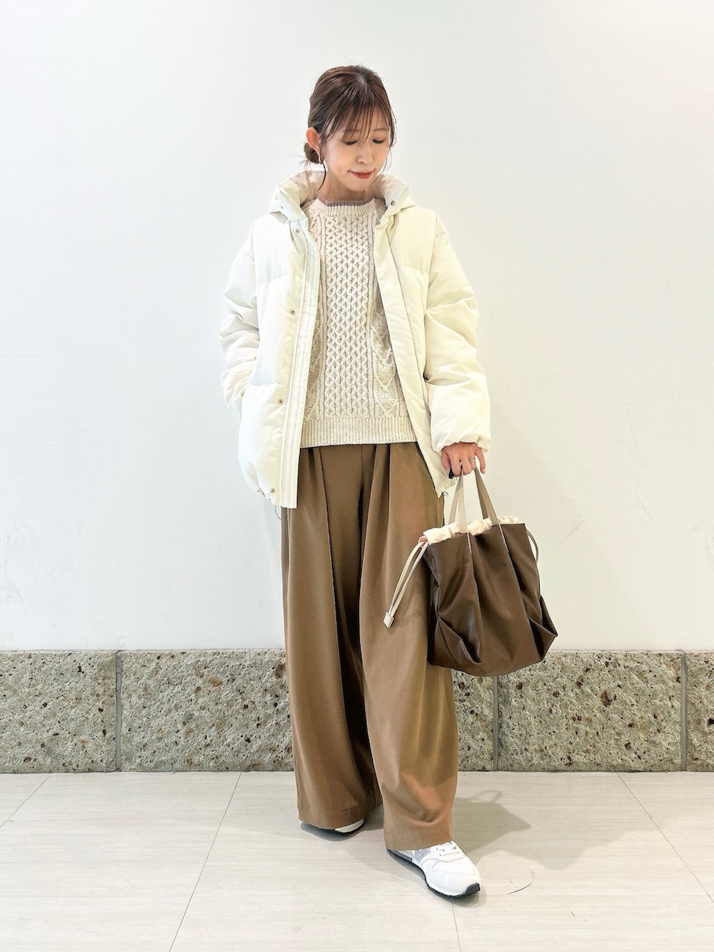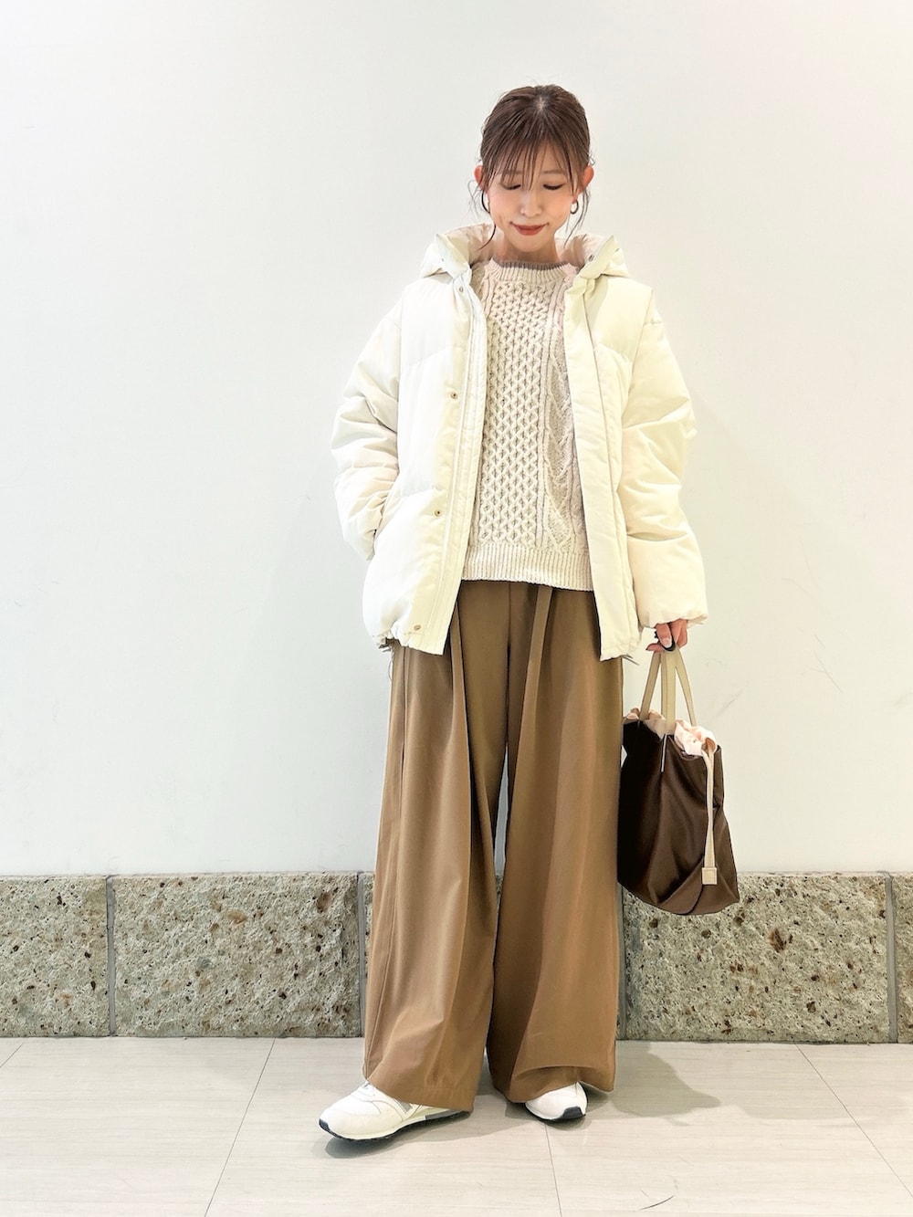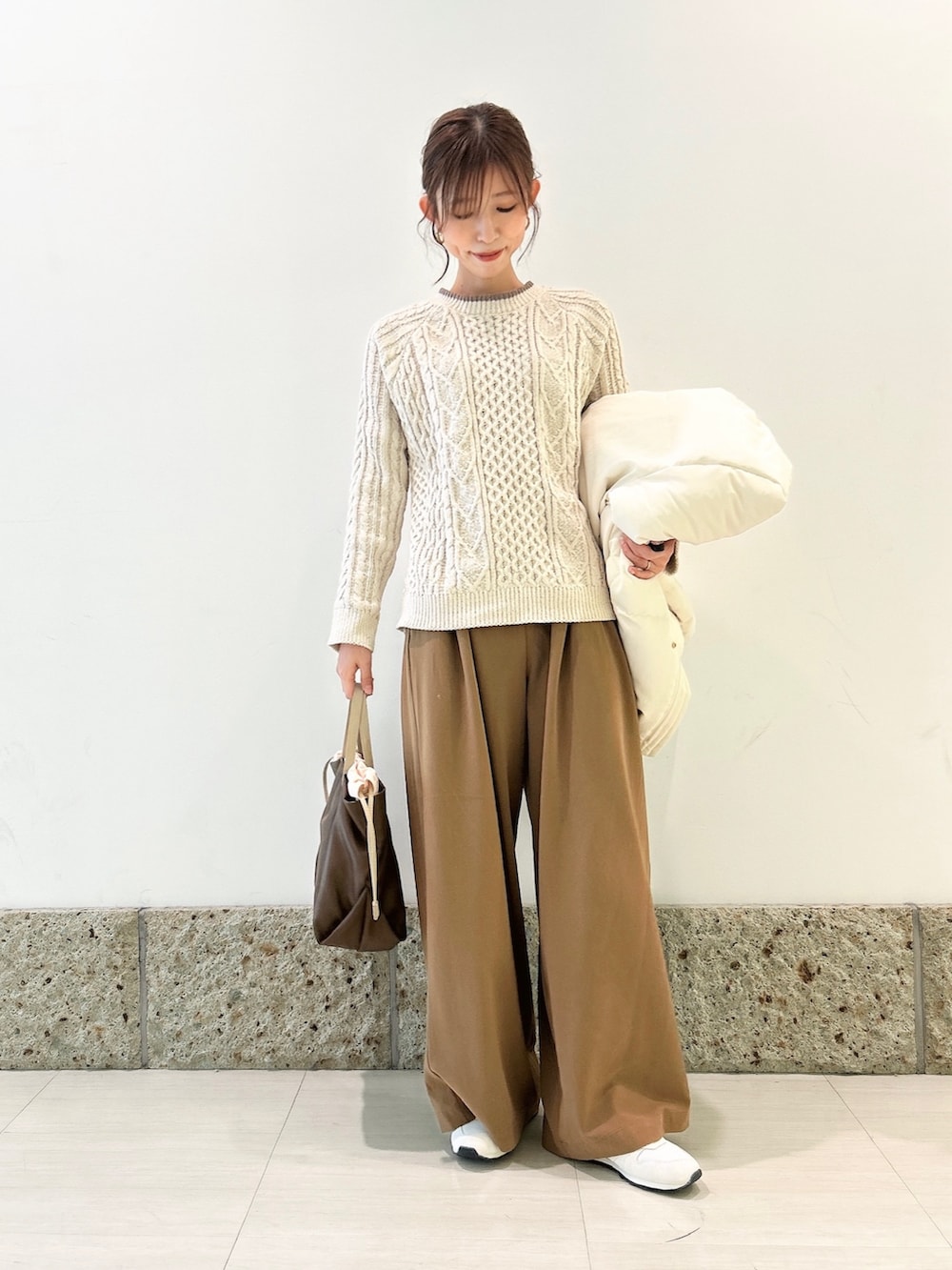トップスは柔らかなアイボリーと首元のベージュのラインが