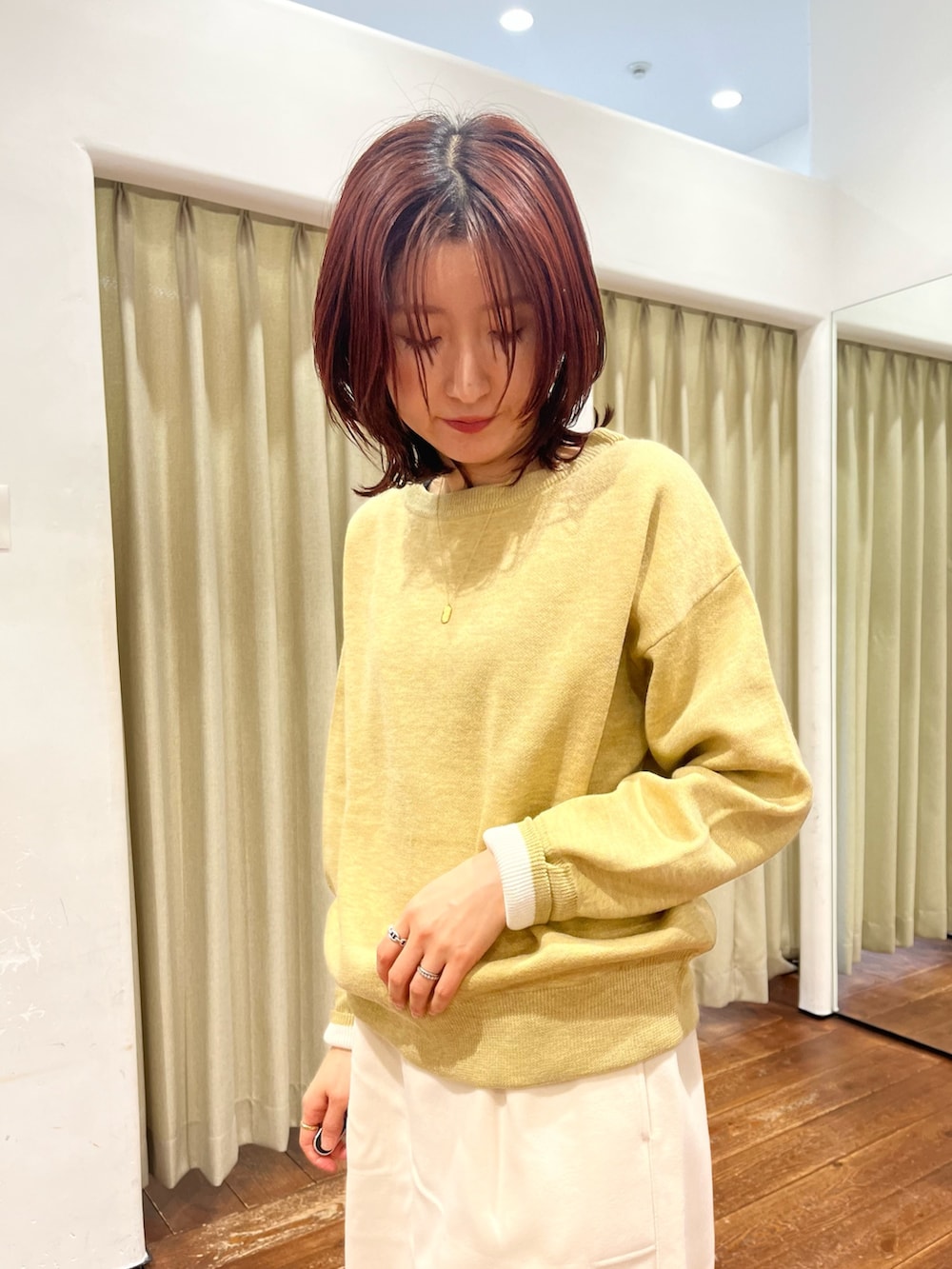 トップスは優しいイエローでWフェイスなので袖口を折り返すと白のカラーがのぞいて可愛いです。着心地も柔らかくて着やすいです。