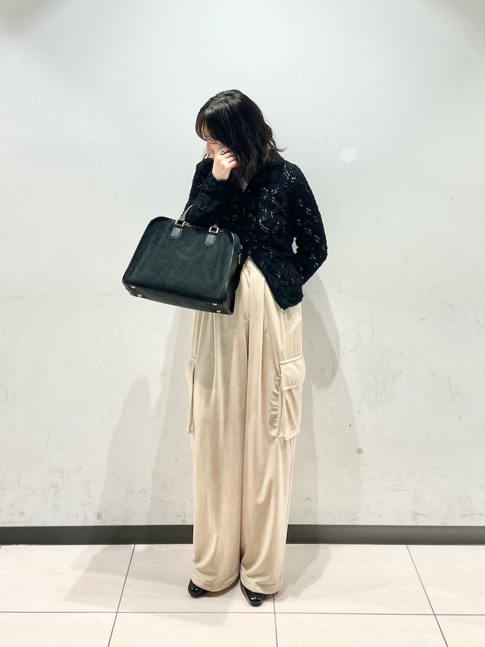 ベロアカーゴパンツは光沢感が華やかなので、ブラックアイテムが増えがちな方にもおすすめです。