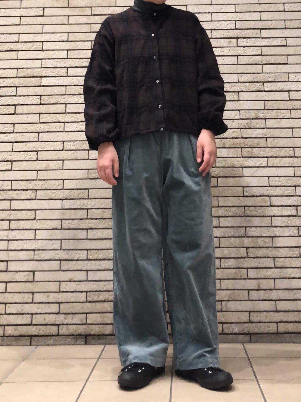 コットンとウール生地で風合いのある、あたたかい素材のブラウスです。落ち着いた色あいのチェック柄ですので、派手になりすぎず1枚で雰囲気のあるスタイリングに。