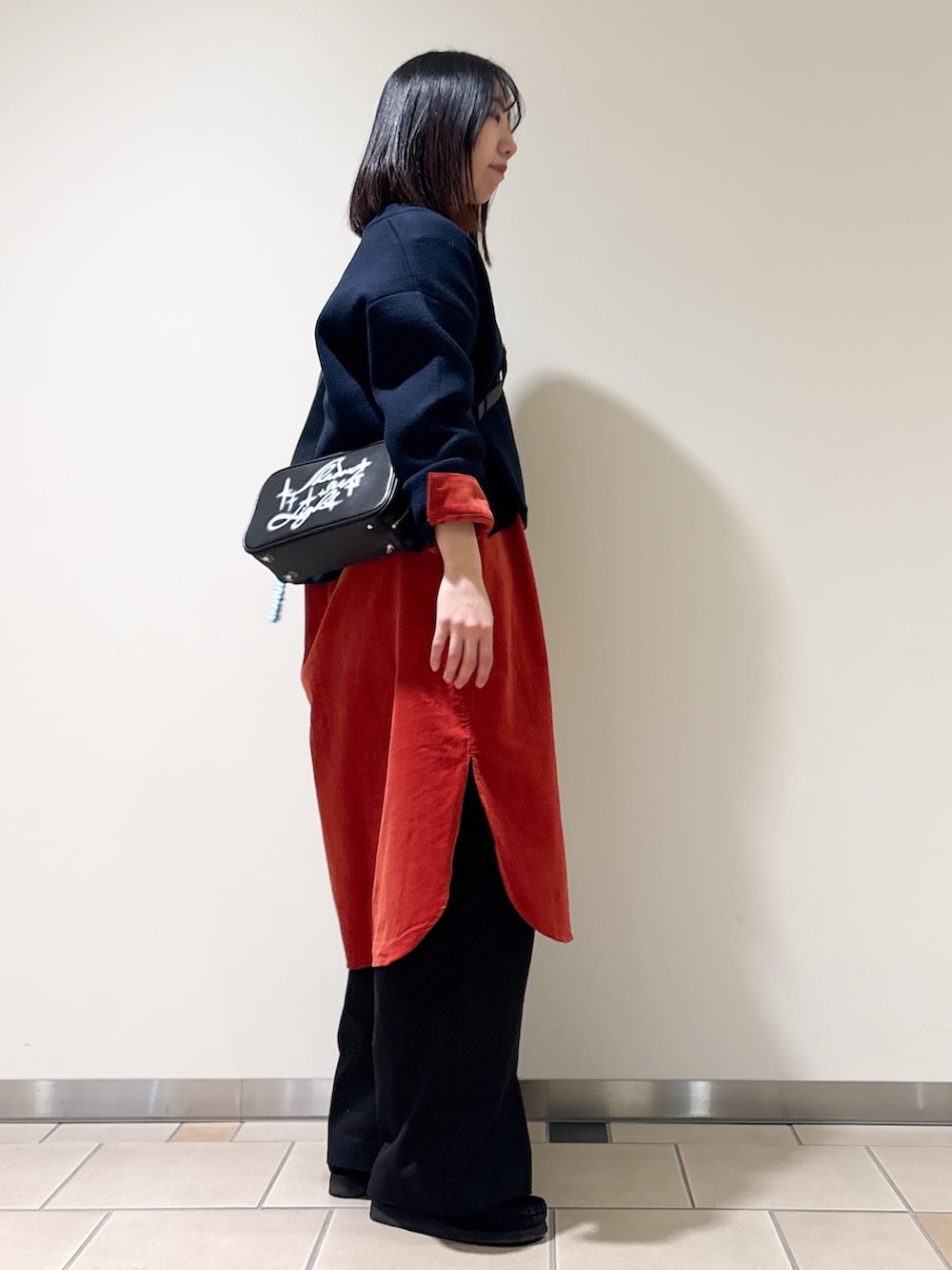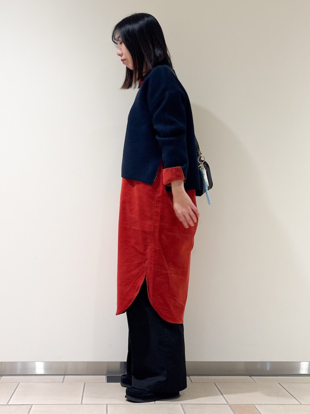 オレンジのシャツワンピースは細めのコーデュロイでハリのある素材。縦ラインが綺麗に見えます!