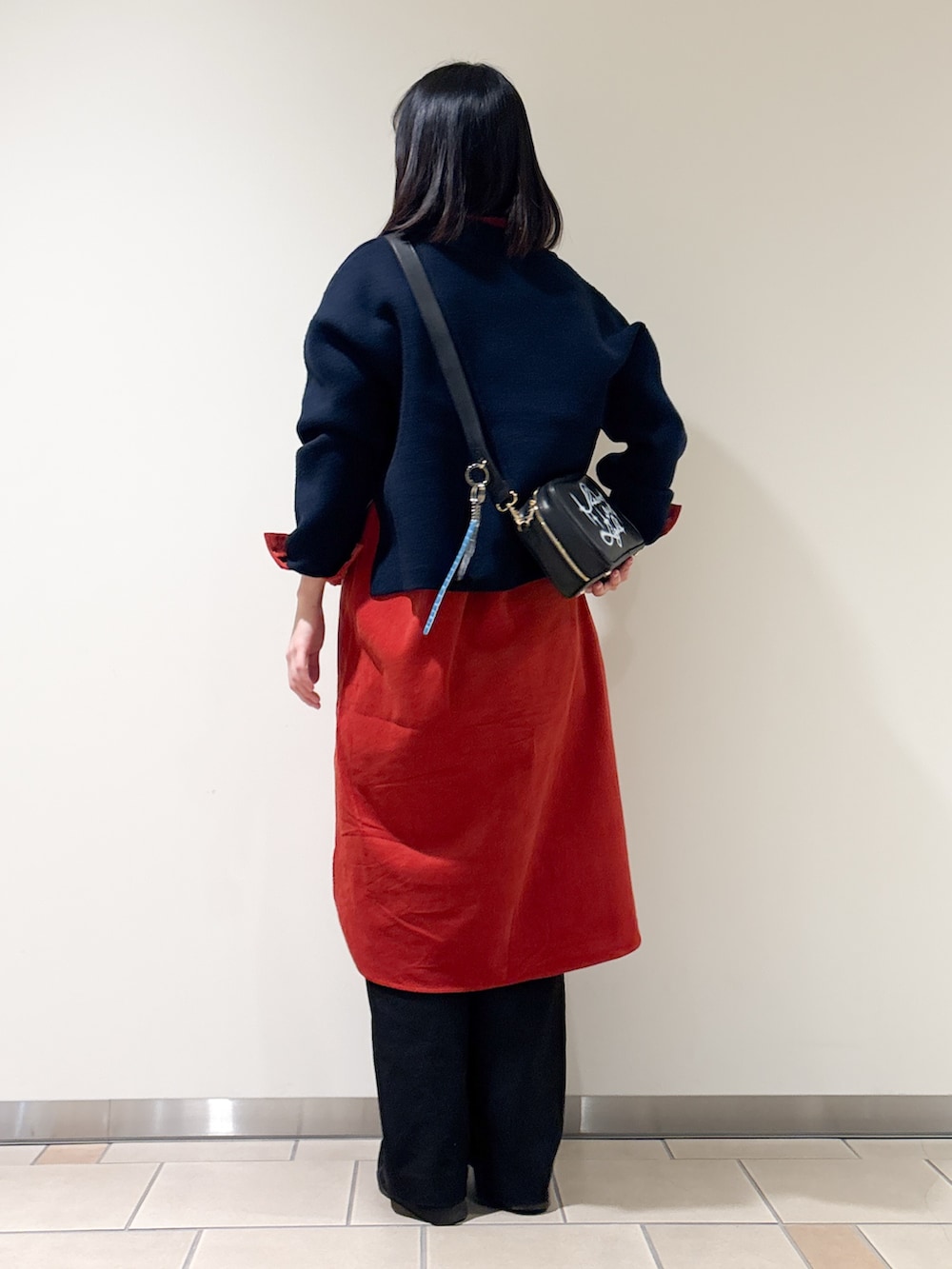 今回はオレンジをより引き立ててくれるネイビーのニットを重ね着しました!ダブルフェイスなので生地は厚めです^^
