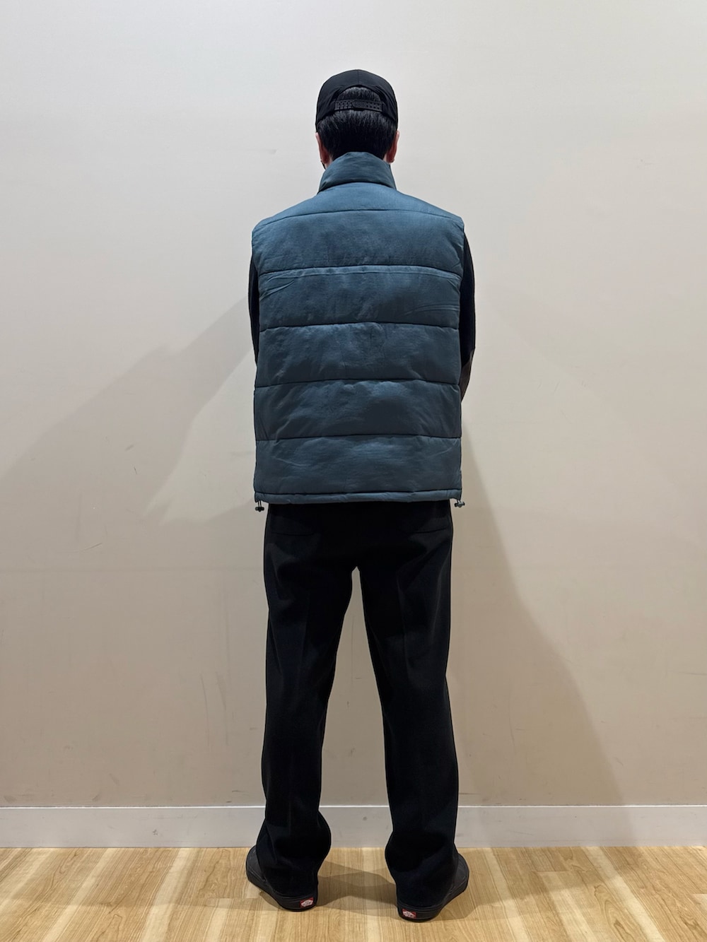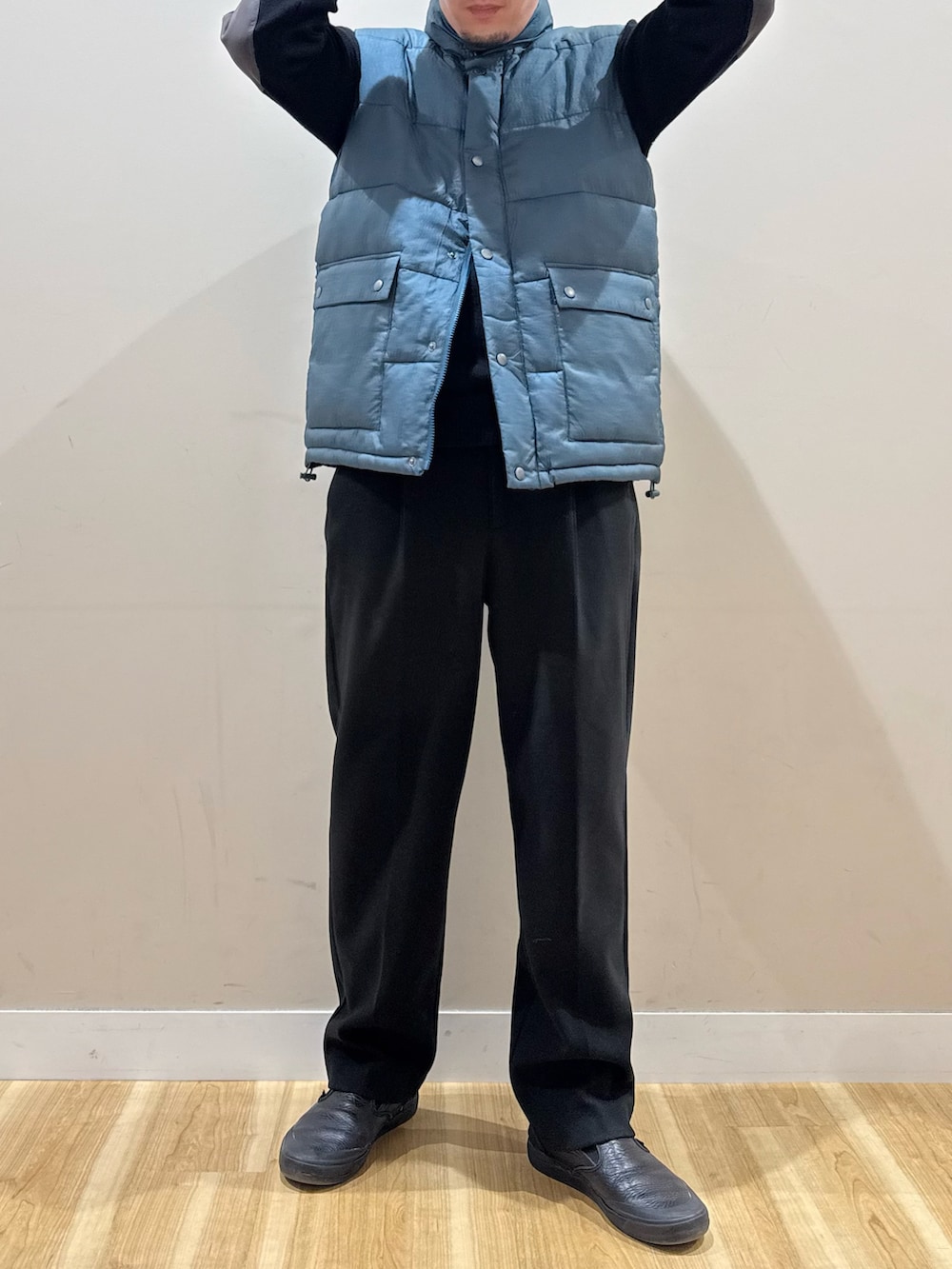 ベストはジップを使って全閉めも良いですが、少し気温が高めの日とかは、あえてジップは使わず、ボタンで首元だけ閉めてインナーをチラッと見せるのも良いです。