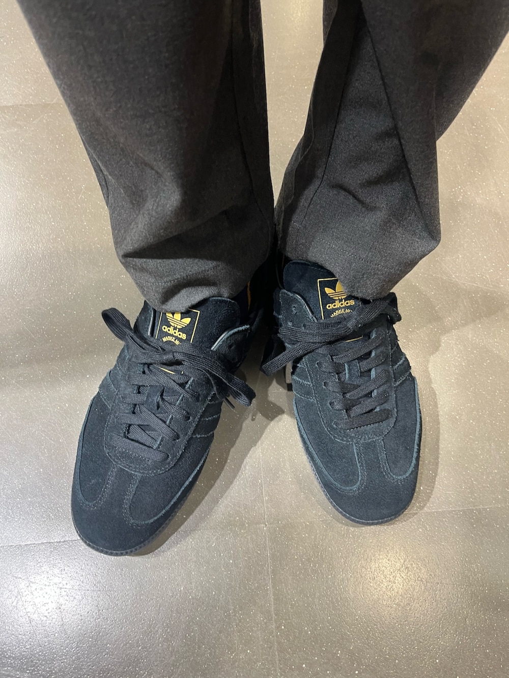 スニーカーはハンドボールでスウェード生地で真っ黒で締めてかっこいいです!