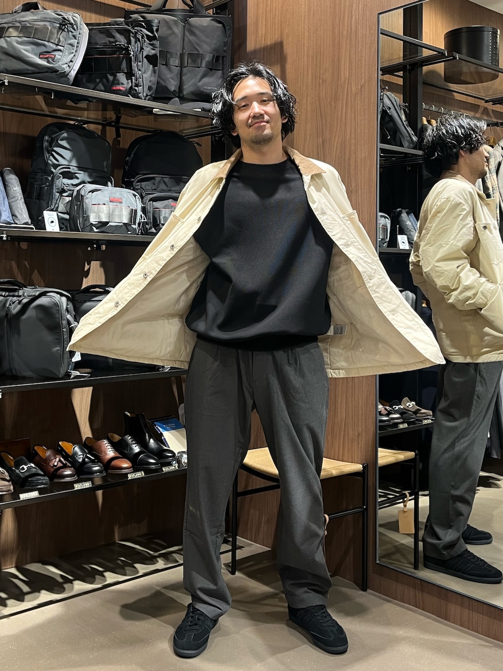 パンツの起毛ウォームアップイージートラウザーはスッキリしたシルエットなんですけど、ワンサイズ大きいLサイズを履いて少しだけゆったり履いて、見た目はキレイ目ですけどカジュアルにしてます!