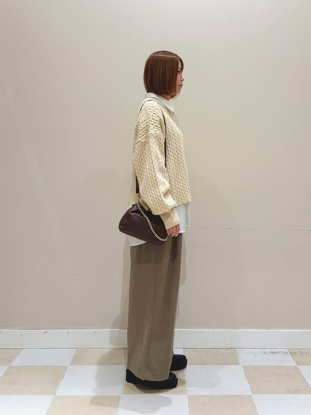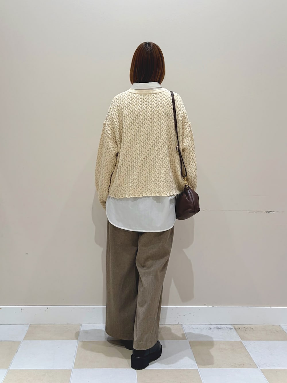 ヘリンボーン柄のニットにシャツをレイヤードし、イージーワイドパンツ、ブーツで少しトラッドなスタイルにしました!