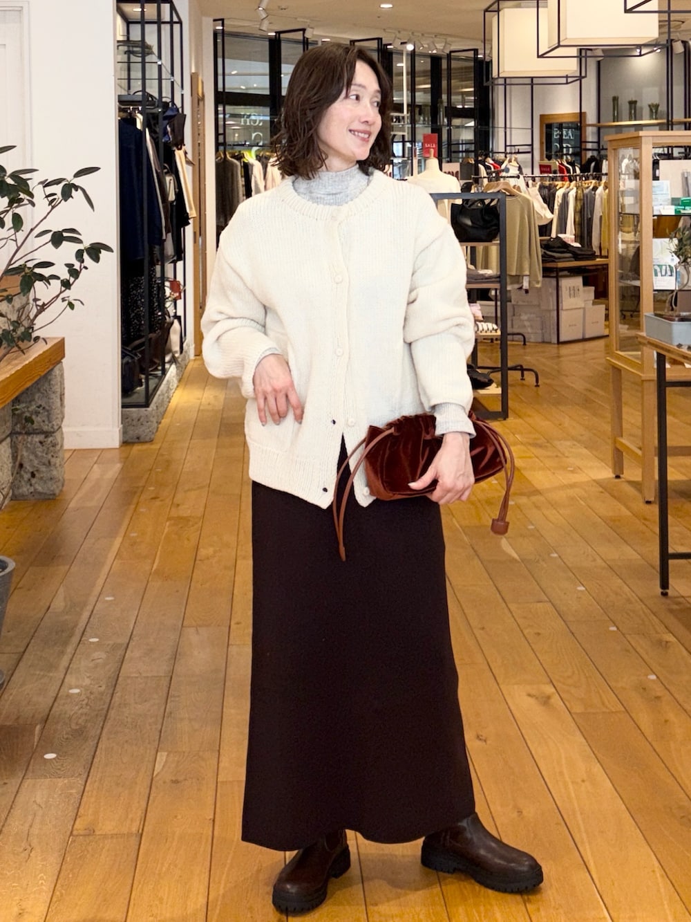 コットンカシミヤのスカートは程よい生地の厚さで、ニットと合わしても重たくならず着回し優秀アイテム。