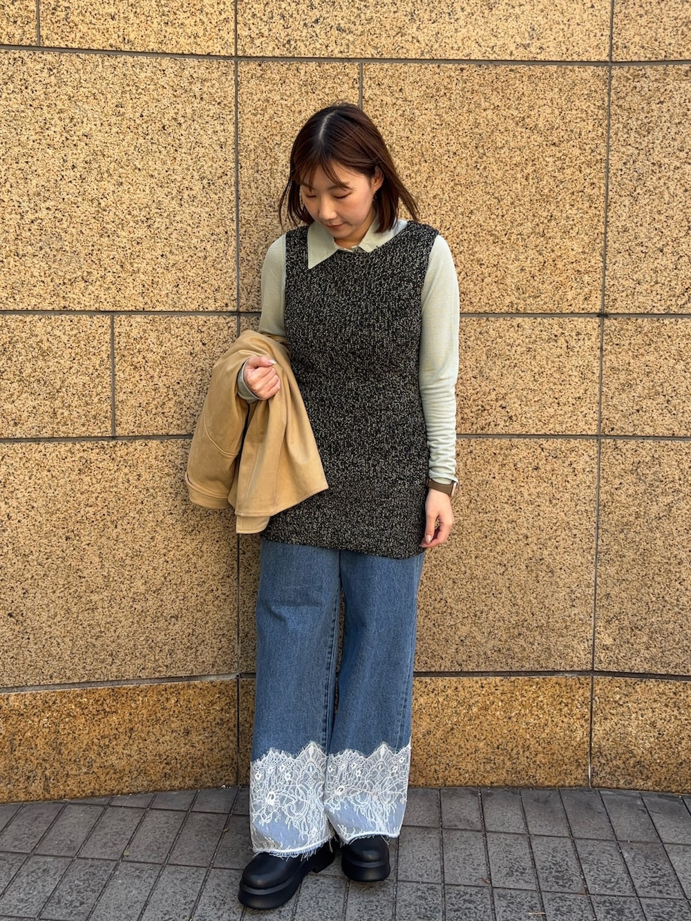 インナーの上にベストを合わせてシンプルすぎないコーデに!アウターを脱いでも可愛いコーデに!ベストはお尻が隠れる長さなので着痩せ効果も!お尻周りの厚みも隠せちゃいます🫶🏻