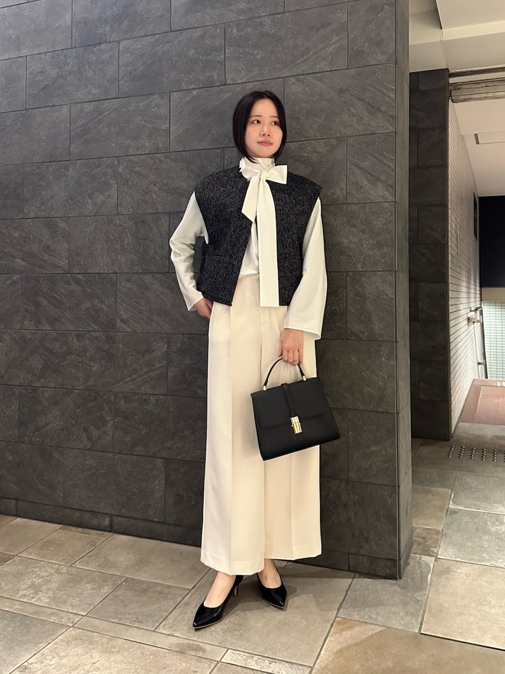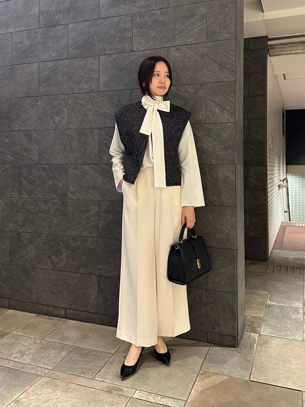 モードな雰囲気に、ボウタイブラウスで華やかさをプラスしました♩