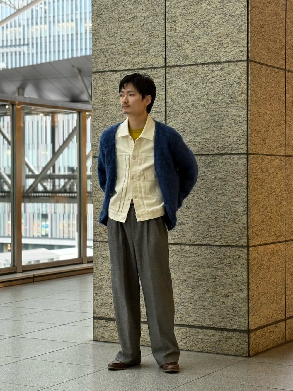 YLEVEのモヘアカーディガンはnotグランジ。彩度が高いダークブルーの色味はグランジ感というより繊細な印象すら与えてくれます。