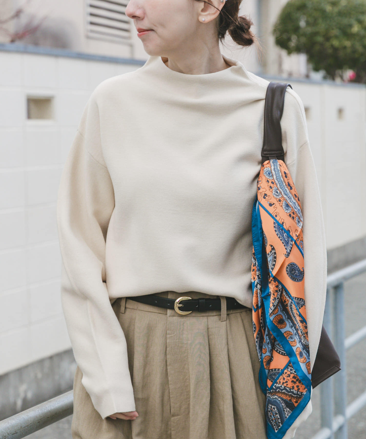 ボトルネックのニットはシンプルながら