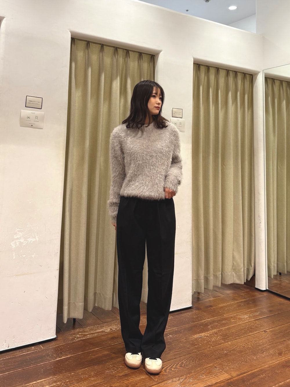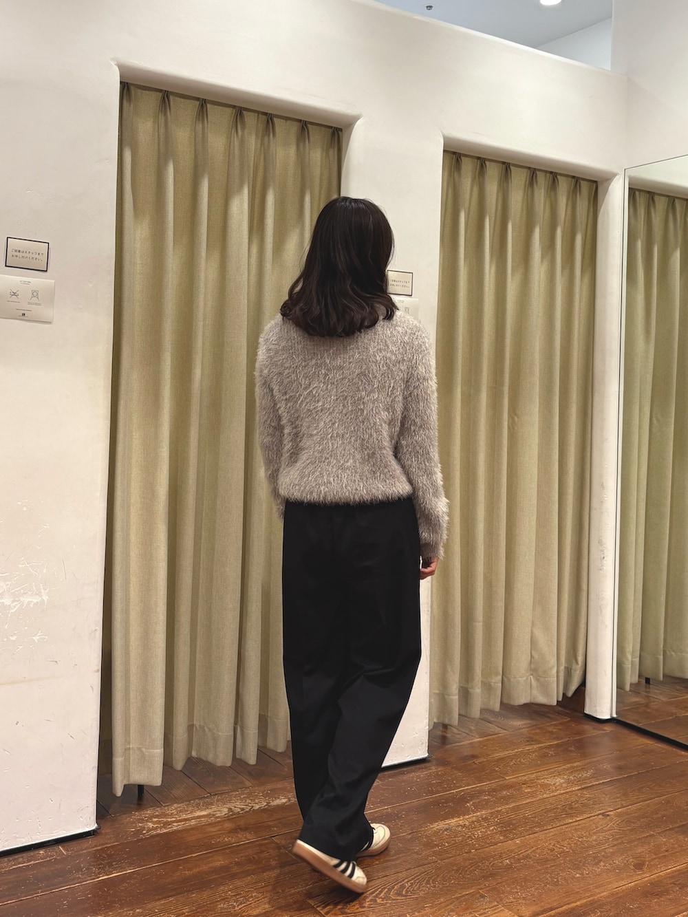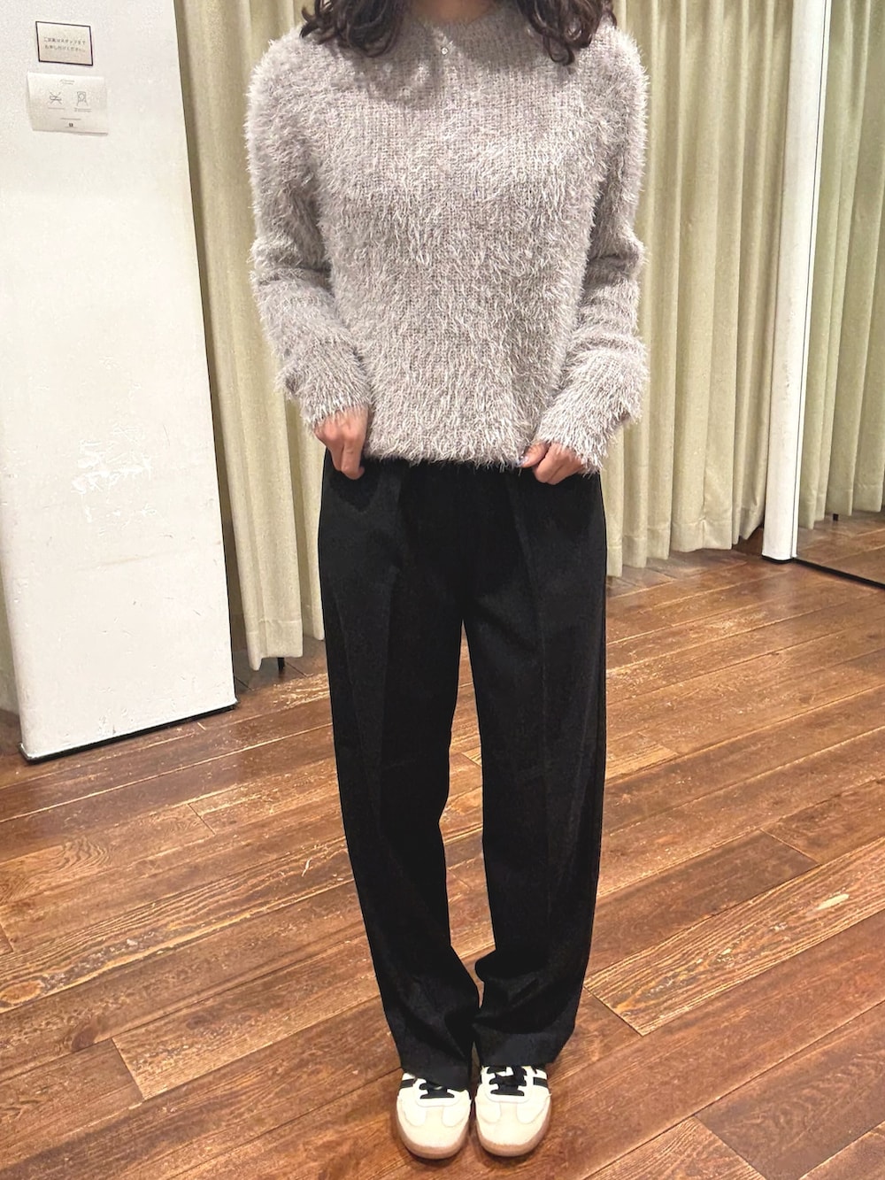 寒い時期に一枚持っておくと便利なウラキモウのパンツに可愛いシャギーのトップスを合わせ、ラフなコーデにしました。
