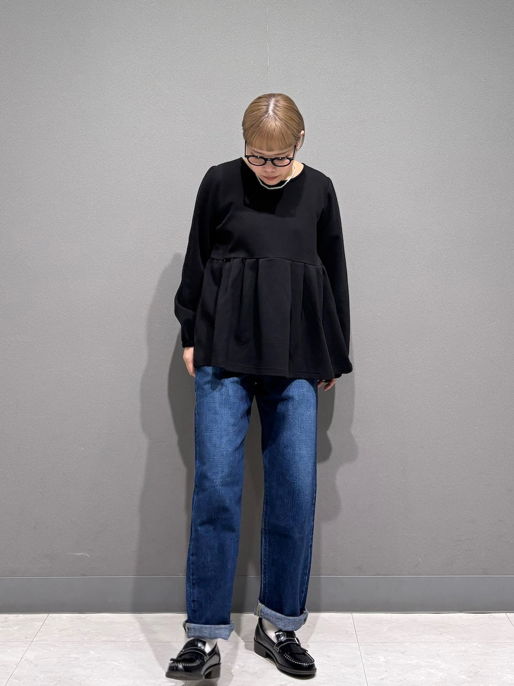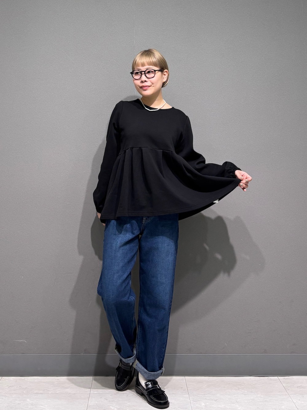 ペプラムトップスとデニムで