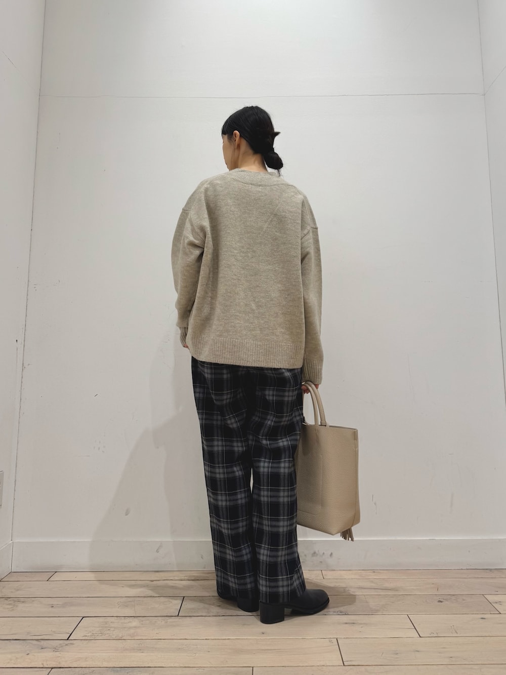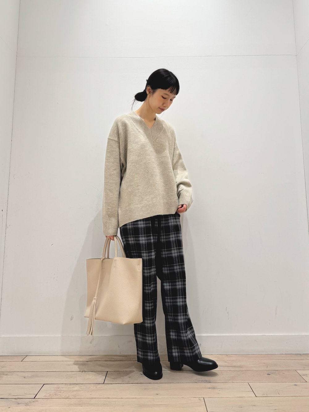 合わせるアイテムによっては少し部屋着風になるチェックパンツには、シャツやVネックのニットがおすすめです◎