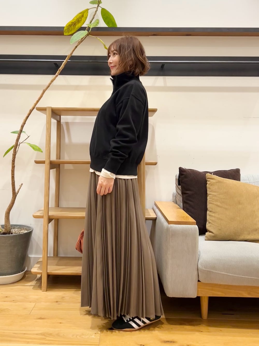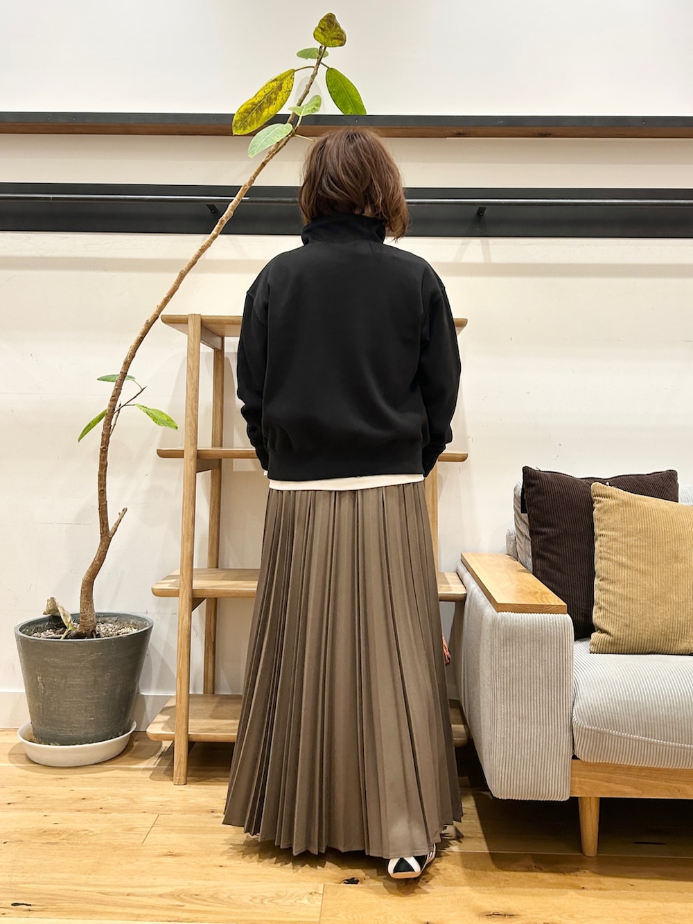 ウールライクなツイル素材、細かくきれいに入ったプリーツが動くたびに揺れて、ニットやスウェットなどボリュームのあるトップスと合わせてもバランスよく着ていただけます♪