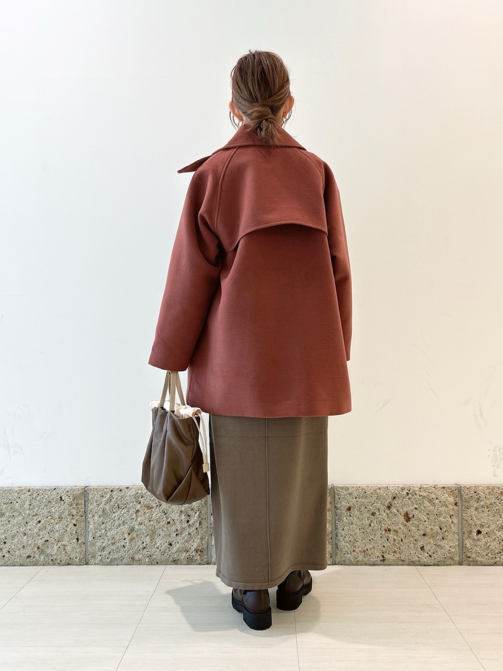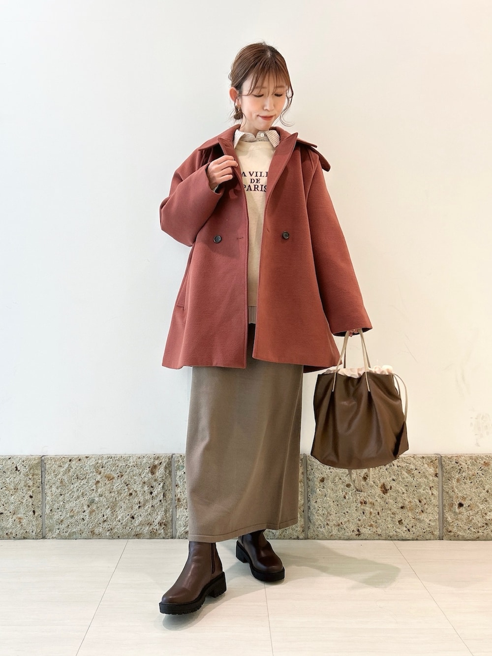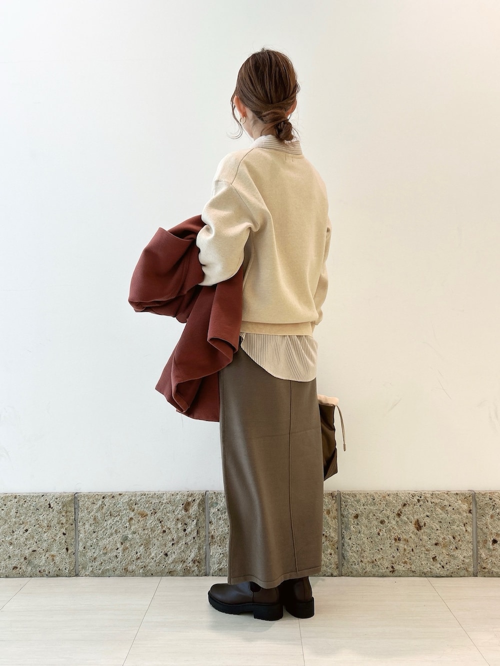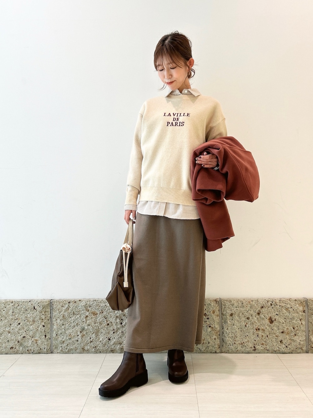 スカートはモカとカーキの間のようなカラーの一着。