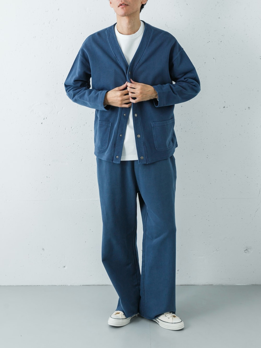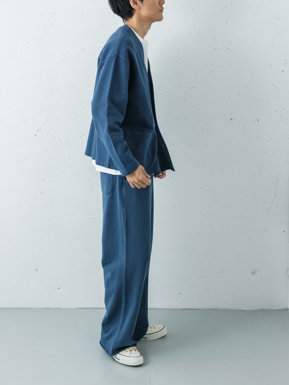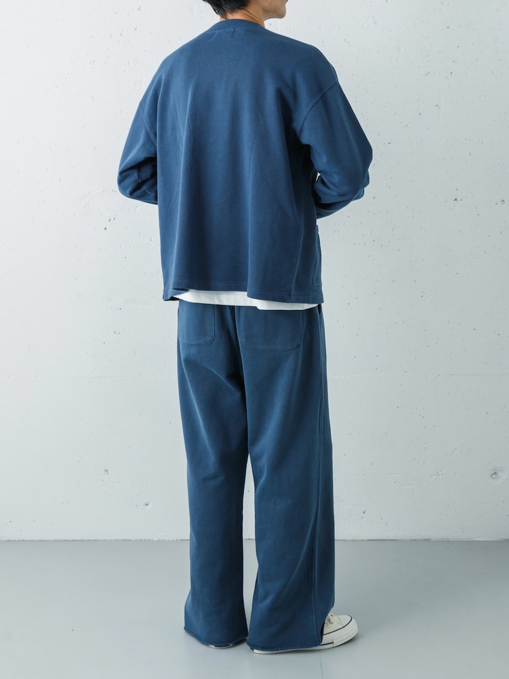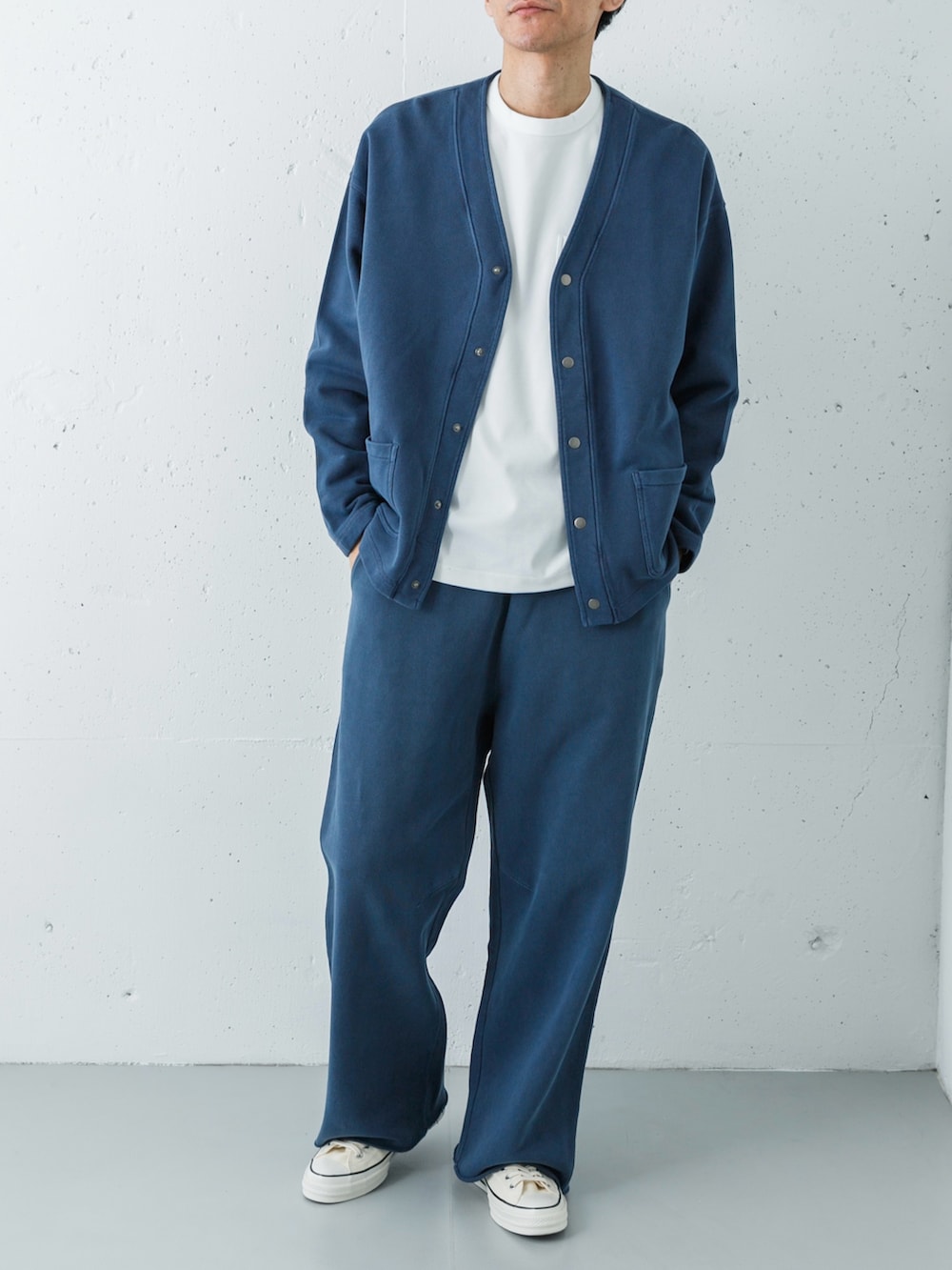足元は、ボリューム感のあるホワイトのコンバース ALL STAR LGCYで、ボトムスのワイドシルエットをバランス良く支えています。全体をネイビー×ホワイトの2色に絞ることで、スウェットの快適さを保ちながら、街着としての品格をキープした「大人の休日ユニフォーム」です。
