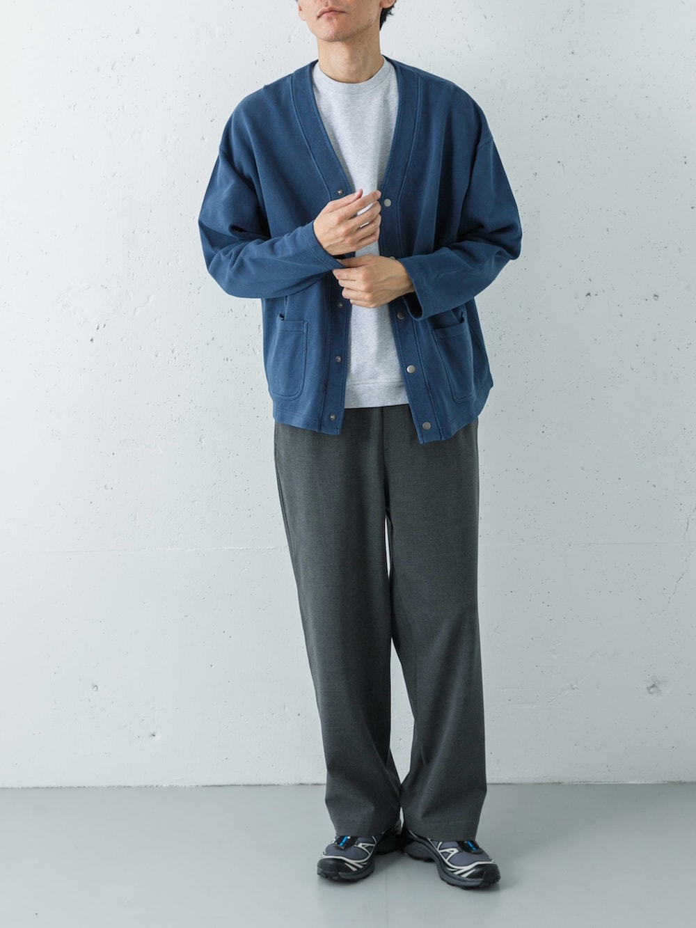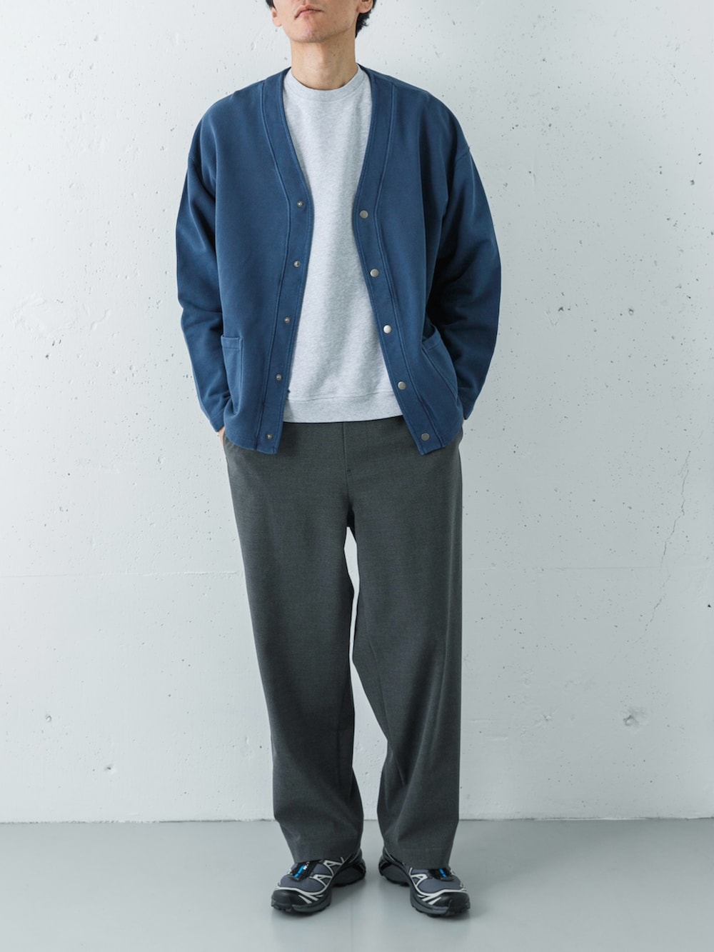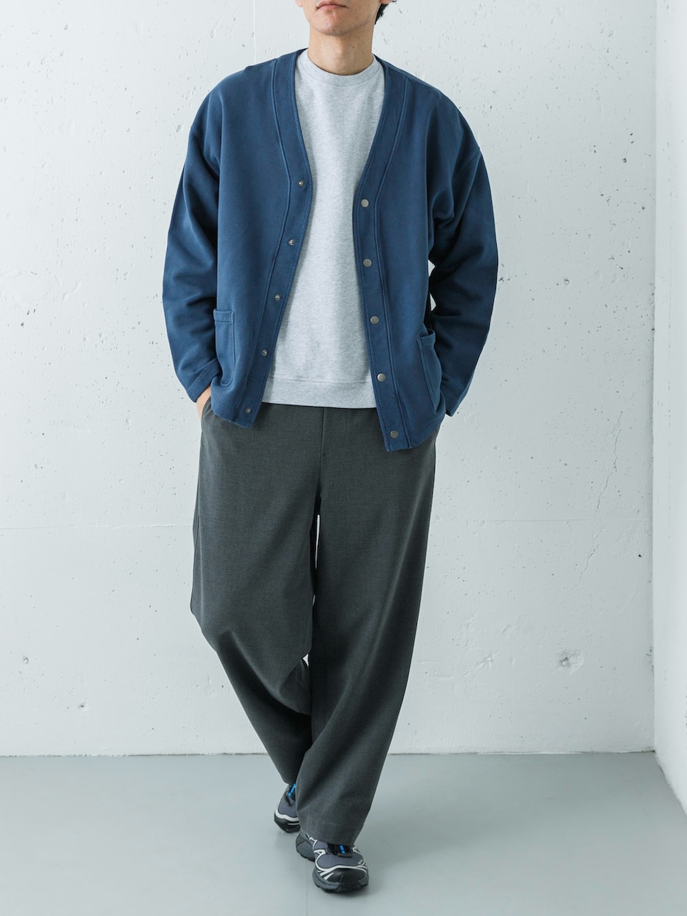 アッシュグレーのRUSSELL ATHLETIC別注スウェットTと、グレーのハイスペパンツで作ったクリーンな下地に、深みのあるネイビーのVネックカーディガンをプラス。スウェット同士の組み合わせながら、Vネックのシャープなラインとネイビーの色味が、全体を部屋着に見せない「外出着」としての品格を与えています。