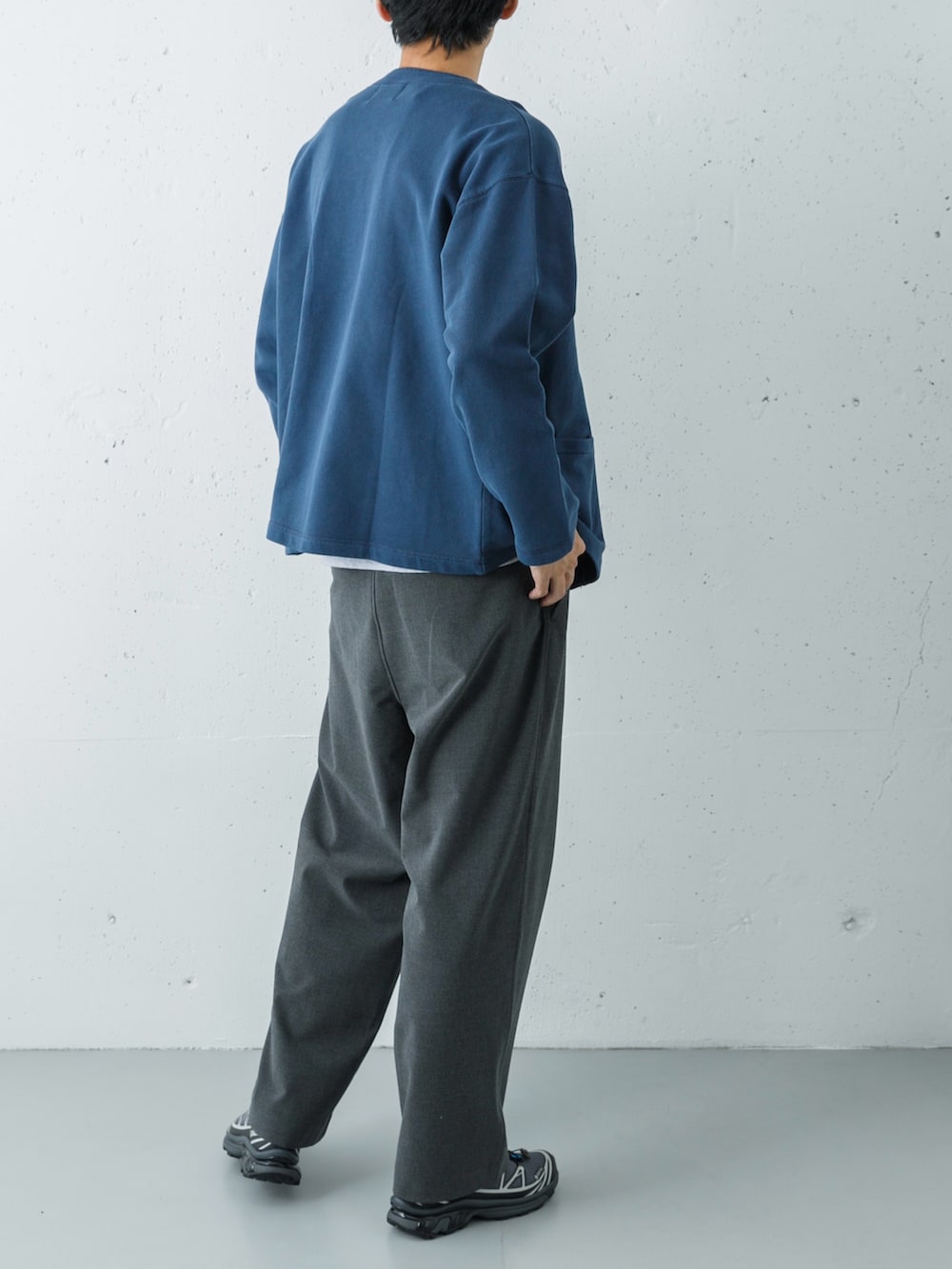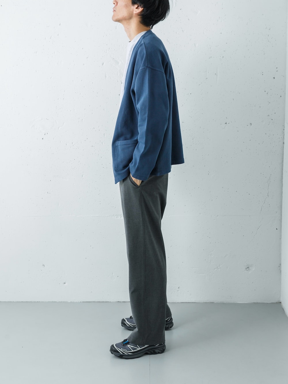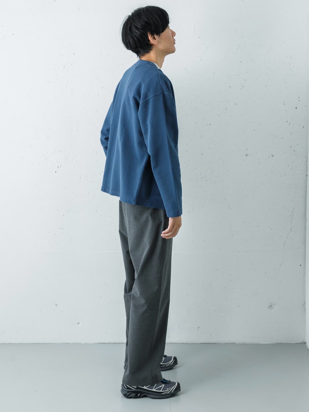 アッシュグレーのRUSSELL ATHLETIC別注スウェットTと、グレーのハイスペパンツで作ったクリーンな下地に、深みのあるネイビーのVネックカーディガンをプラス。スウェット同士の組み合わせながら、Vネックのシャープなラインとネイビーの色味が、全体を部屋着に見せない「外出着」としての品格を与えています。